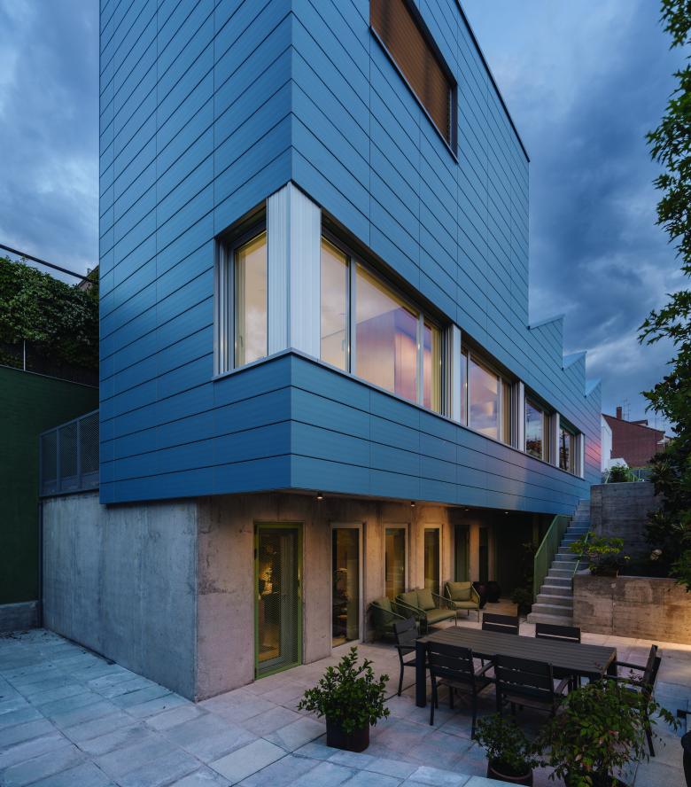 Das kühne Äußere des Hauses wird durch sein Scheddach und die blaue Keramikfassade des Systems KeraTwin von Agrob Buchtal begründet, kontrastiert von der markanten Erscheinung gewellter Stahlplatten. Die Fassade dient nicht nur der Ästhetik. Sie verknüpft mehrere tektonische und technologische Strategien miteinander, um Energieeffizienz und Umweltqualität in das Projekt einzubringen. Um die Langlebigkeit des Hauses sicher zu stellen, entscheiden sich die Bauherren auf Empfehlung der Architekten für eine vorgehängte hinterlüftete Keramikfassade. Sie ist robust und langlebig, gleichzeitig aber auch flexibel rück- und umbaubar. Konstruktion und Keramikplatten bieten dem resilienten Grundkonzept der Architektur von Ignacio G Galán und OF Architects die beste geeignete Basis, um Gegenwart und Zukunft nachhaltig miteinander zu verbinden. Die beweglichen Fenster im Scheddach sind mit automatischen Jalousien gekoppelt, die Wärme und Beleuchtung steuern, um einen gut belüfteten und komfortablen Innenraum zu schaffen. Solarpaneele, die von der markanten grünen Stahlkonstruktion auf dem Dach getragen werden, unterstützen den Betrieb der Fußbodenheizung im ganzen Haus.