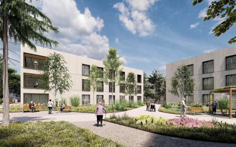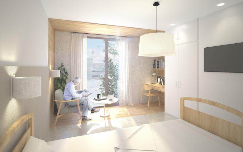 The project seeks to solve an occupation in an irregular triangular-shaped plot that allows an adequate arrangement of the groups of living units. A first level as a plinth houses the entire common program (technical and public) and the day centre. On this plinth there are two independent buildings in which the living units are located. Each of these buildings includes two coexistence units per floor, which share a common core of communication, facilities, and services, which facilitates communication between the two units. This scheme is repeated on 3 floors. The project takes advantage of the possibilities offered by the topography of the land to be able to reduce the interference of the service accesses with the outdoor and more private landscaped areas in the highest part. There is a clear separation of technical uses and public uses, allowing the absence of interferences between the two circuits.