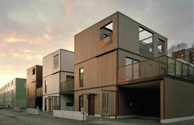 The buildings are constructed with prefabricated timber elements. Few but flexible module types have been combined to create variety. The exterior treatment of stained timber panels, of alternating width and colour, references nature and the existing fabric.