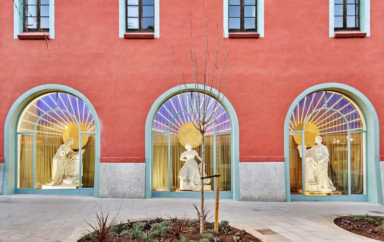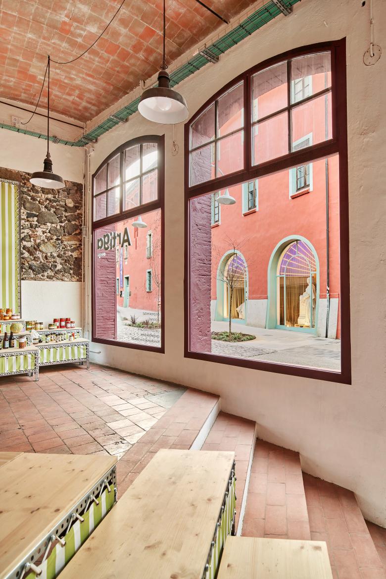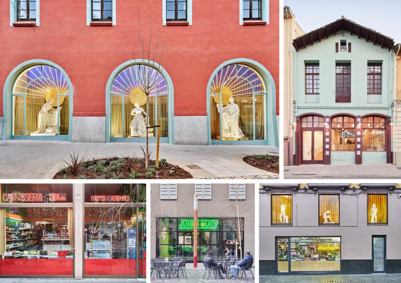 La escuela se abre a la ciudad destapiando tres grandes arcadas y reorganizando la planta baja. Ahora el taller de serigrafía y grabado da a la calle y se muestran tres esculturas de Miquel Blay: L’Educació, Al•legoria de Madrid y La Llei. Las hornacinas se equipan de fondo escenográfico con falsa perspectiva y “cielo”. Esta intervención tiene una réplica en las tres ventanas del altillo de una tienda, donde se da respuesta a un problema habitual: las plantas primeras de almacén opacas. Se apuesta por la transparencia máxima de los escaparates de locales, retirando vinilos, reorganizando mobiliario e instalando rótulos de neón.
