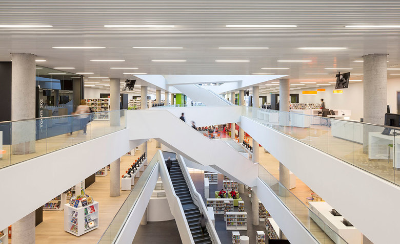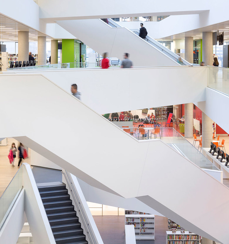 The new library is a multifunctional cultural hub with direct accessibility to the vibrant surrounding urban context of historic and new buildings, and the buzz of downtown. The library building stands as a reflection of the diversity of the community and the modern life within the municipality as a whole, and as a flagship for all 14 branch libraries servicing the whole municipality.