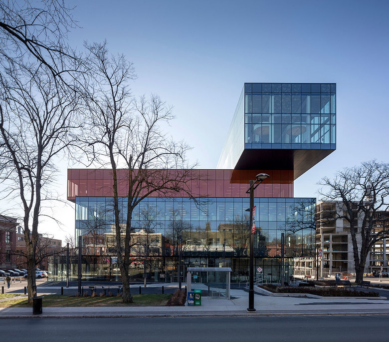 The construction of the library is essentially cubic in form with four significant 'volumes' vertically placed on top of one another with a horizontally twisted and shifted facade alignment. A number of distinctive cantilevers and one signature larger cantilevered element create a voluminous expression whereas the remaining façades align elegantly with the neighbouring façade of the classic architecture of Dalhousie University’s Architecture School. From the top of the building - the Halifax Living Room - there is access to an open green roof terrace providing a unique view towards Halifax Harbour, Citadel Hill, the historic George’s Island, Dartmouth and onto McNabs Islands that reaches out towards the North Atlantic Ocean.