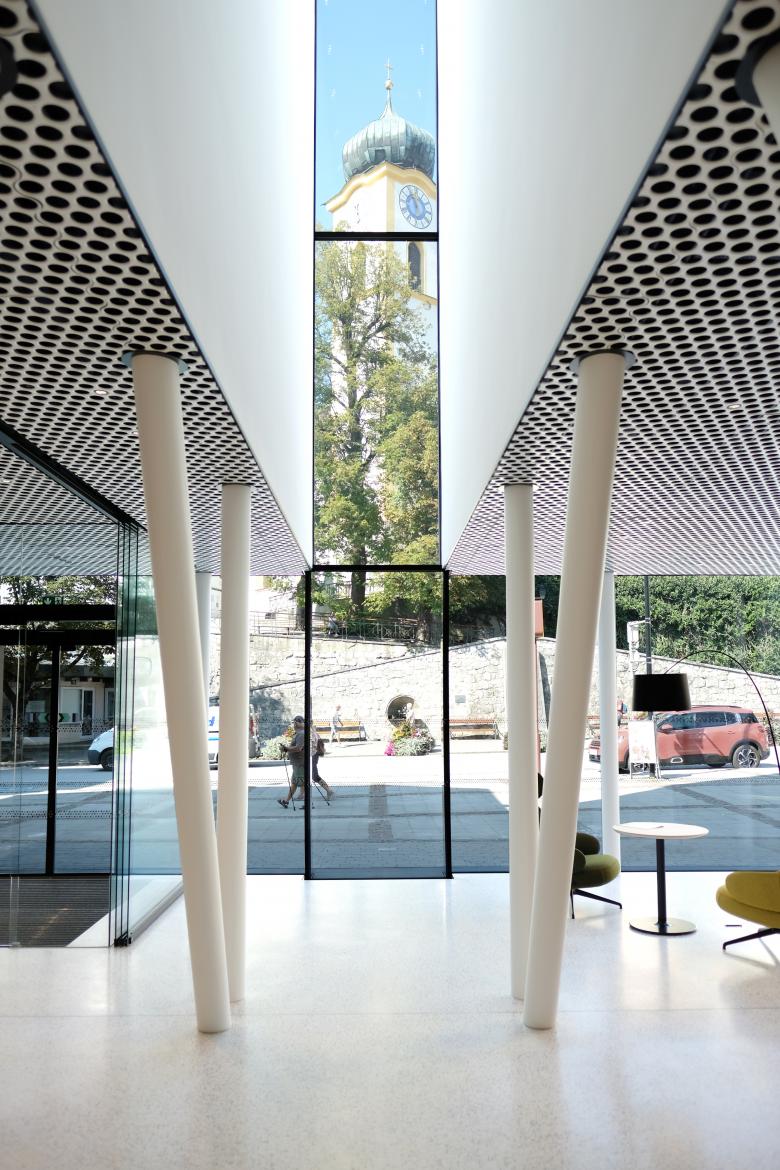 Durch den Umbau wird auch die Erschließungssituation geklärt. Der Kundenzugang der Bank befindet sich nunmehr ausschließlich am Oberen Stadtplatz. Die Bewohner und Nutzer betreten das Haus über den Eingang am Arkadenplatz.