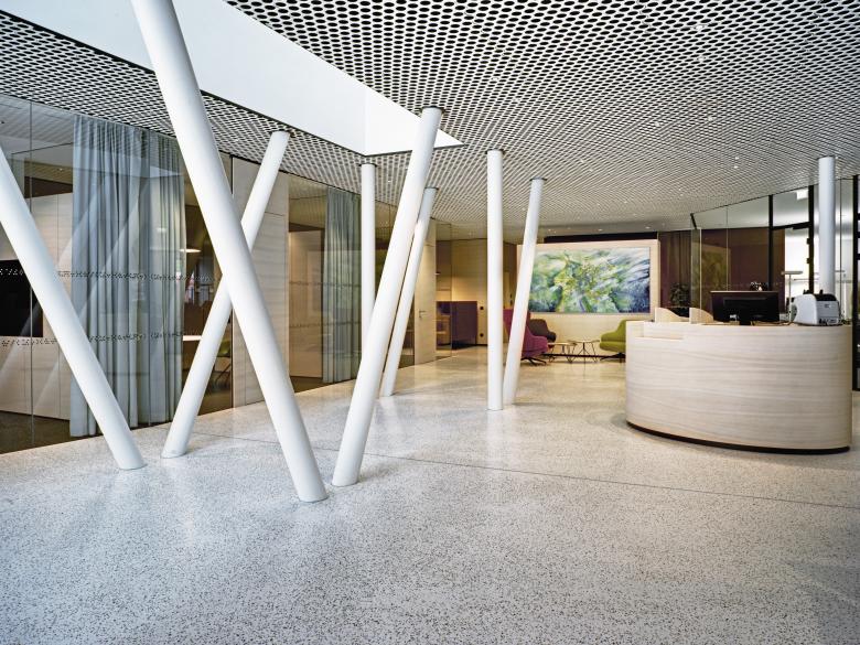 Das neukonzipierte Foyer erfährt mit dem Austausch raumtrennender Wandscheiben durch freistehende Stahlstützen eine direkte Öffnung zum umgebenden Außenraum.