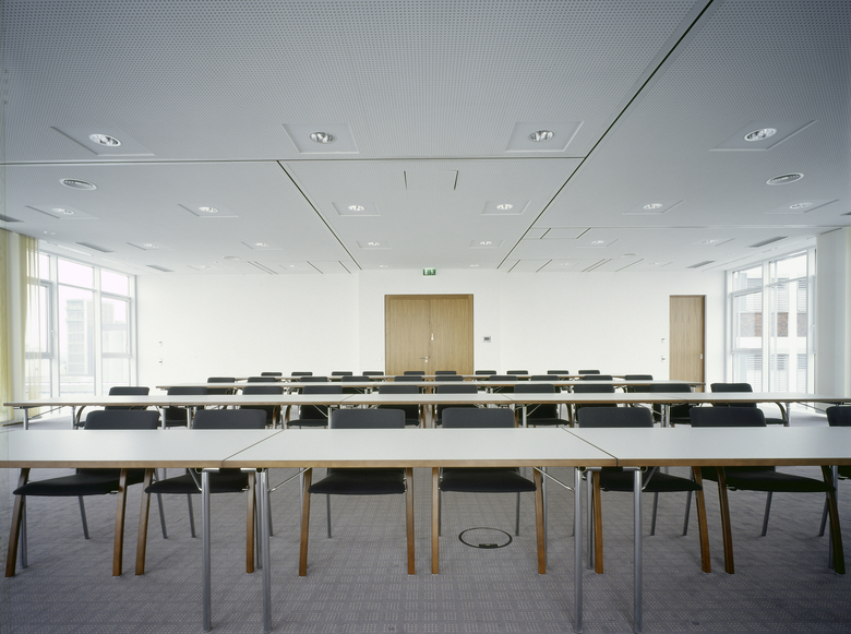 Der Konferenzbereich wurde mit modernster Medientechnik ausgestattet. Die Verdunkelungs- und Sonnenschutzanlage und die Beleuchtung wurden in EIB-Technik installiert. Die Lüftungsanlagen in der Decke und das Beleuchtungskonzept wurden für die variable Nutzung geplant und vorgehalten.