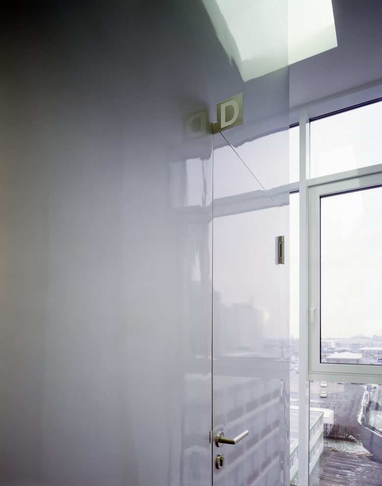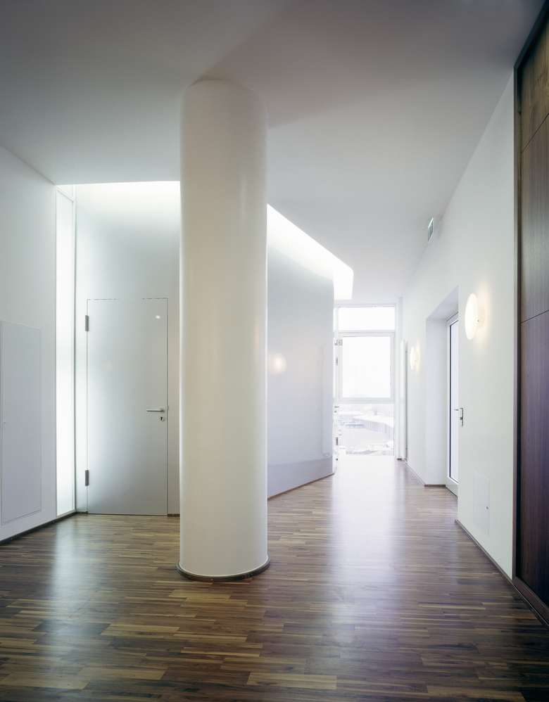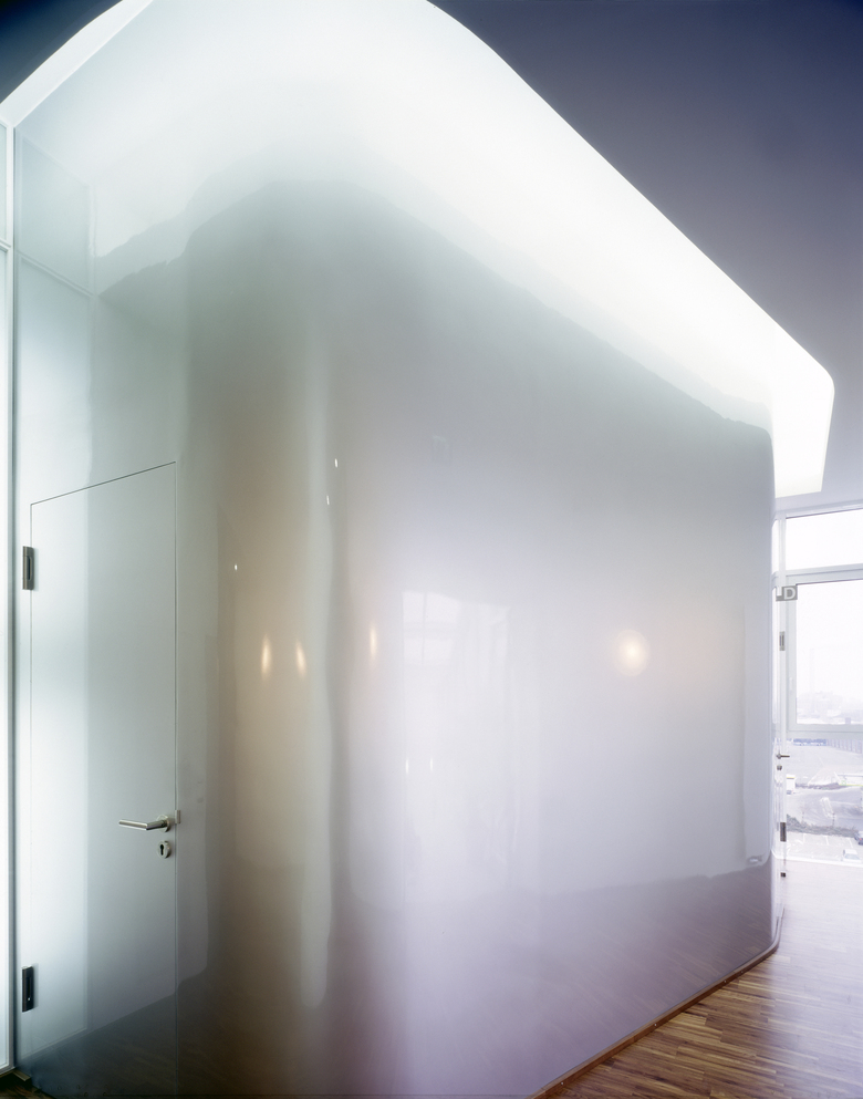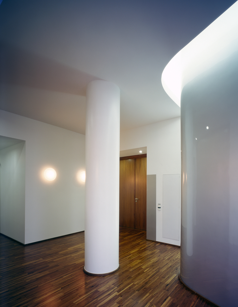 Die Materialauswahl ist reduziert auf Holz (Nußbaum) für Böden und Einbaumöbel, stumpfe bis hochglänzende Oberflächen der Wände und Decke. Die Wirkung der Oberfläche wird durch die teilweise indirekte Beleuchtung unterstützt.
