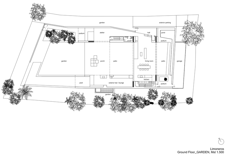 Periphery is central – The periphery and the surrounding wall are filled with different programs, so it communicates with the central space of the ground floor. These contents wrap around the living space/garden like a neverending landscape: a still water pond with waterfall, turtles and morning sun, herb garden, kitchen, BBQ lounge, pool lounge, swimming pool, chill-out pool area, jungle, atelier/library, the entrance. Depending of what time of the day, social occupancy and what mood you're in, you choose to interact with the peripheral programs, from leisure and sport to reading, chilling, cooking, etc. There is an over-the-edge opening along the poolside, where there is a beautiful view to the mountains and where the evening sun comes in.