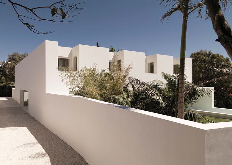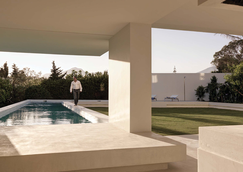 White sculpture and blue Andalucía sky – There are no windows or openings to the outside/public space, so the house appears as a white and cubic sculpture, similar to the Moorish patio houses in Andalucia. Only the plants give a sign of the interior life to the outside. Everything is covered in white plaster, creating this endless playful landscape just covered by the deep blue Andalucia sky.