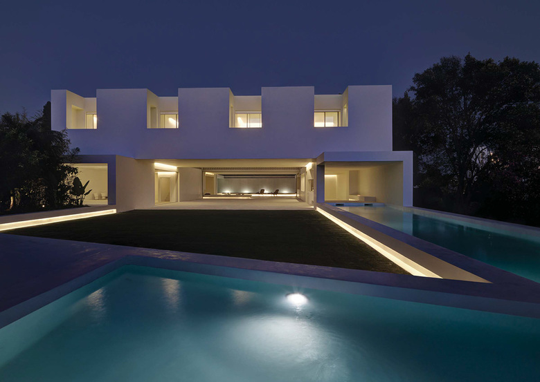 Program – The plot is situated in a suburban area of private villas next to a golf course near Marbella, Spain. The program is a house for a family with kids and guest rooms for visiting friends, a total of 480 m2 inside area. There was an existing house, typical for the area with a beautiful garden, so we kept the plants. Living outside in a private garden – Being in Andalucia, in the south of Spain, the idea was to create a huge garden with large covered outside spaces, giving some shade when needed, where you could live outside day and night, all year long. It’s all about catching that twilight with your friends and family, chilling out with some tapas and great Spanish wines. At the same time we needed to create the necessary privacy towards the neighbouring buildings, so you could live outside without being exposed. The concept therefore is that the whole site is a garden surrounded with a peripheral wall filled with content, that’s the living room, a private garden. Above that living room landscape we set a patio house ‐ a house over a private garden. In the winter time, one covered part of the private garden can be closed with sliding windows and heated.