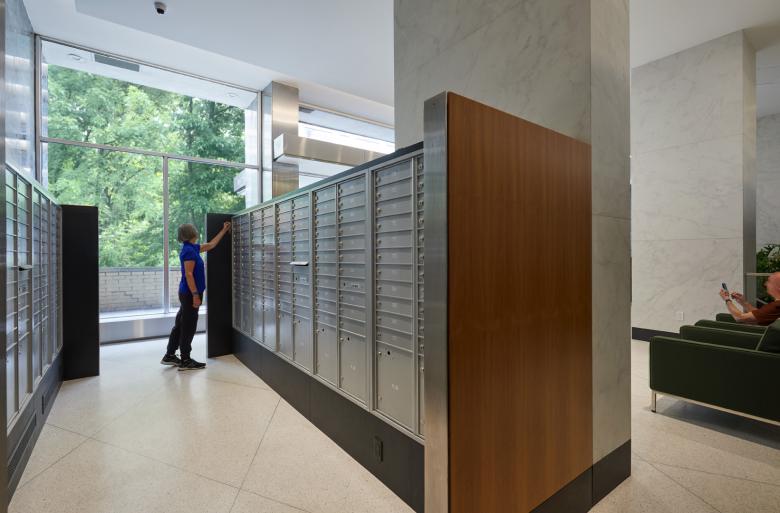 BFA was engaged to renovate the apartment building’s generous 2,200-square-foot lobby to add needed amenities including an ADA ramp, an accessible mailroom, a larger package room—a necessity in the age of online shopping—and new lighting and air conditioning.
