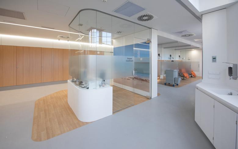 ·Coronary Unit and Day Care Unit:The renovation of the Coronary Unit is located on the pavilions 0 and 1, on the 6th floor of the Hospital Clínic. It consists of two parts: the day care unit and the critical care unit. The waiting area is the central common space, from where you access to both areas. The day care unit has capacity for 14 patients, and includes all support areas for patients and health professionals. It’s an open space with glass partition walls, allowing natural light to enter to all the space, and at the same time closing spaces individually. The central nursing point allows an optimal functioning of the area. The critical care unit has 10 single rooms for critical patients, and 2 single rooms and 2 double rooms with bathroom for semi-critical patients. Rooms are situated around the central nursing station, from where all the rooms are visible. The nursing station has different areas: working area, medication working area, storage and cleaning area. On the remaining spaces of the unit are located offices and rooms for health professionals and technical areas. Partitions between rooms and corridor are made of automatic sliding glass doors, and partitions between rooms have glass windows. Glass is electropolarized, allowing it to be transparent or opaque according to each patient needs. There are two interior rooms without windows that can have access to natural light through the glass partitions with the next room. The unit enjoys plenty of natural light due to its location on the 6th floor of the building. Natural lighting has been upgraded with glass partitions, and the only closed spaces are bathrooms, lockers and technical areas. Patients are in direct contact with the outside, in a sensitive and visual way.