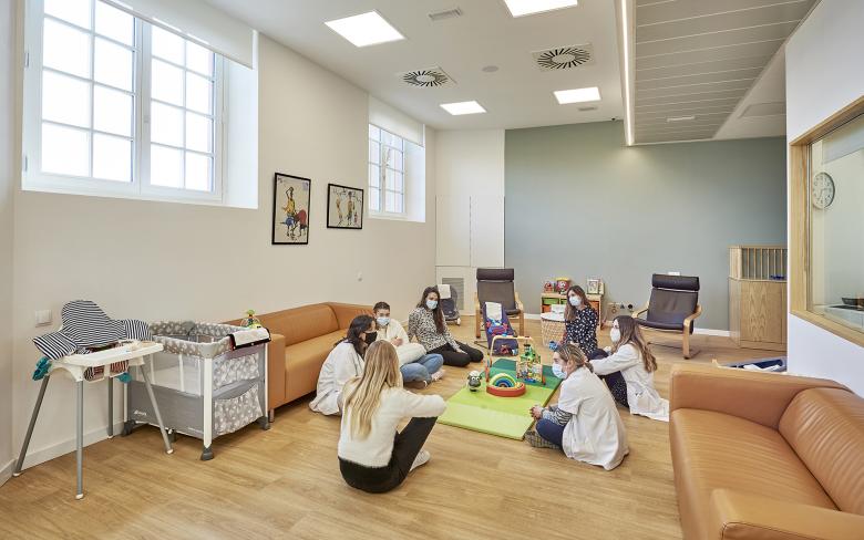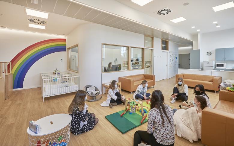 ·Mother-baby Day care center and Outpatient area for Perinatal Mental Health: The Perinatal Mental Health care center and outpatient consultations of the Hospital Clínic de Barcelona is a new space for women who have just become mothers and have a mental health pathology. This model is unique since the mother accesses it with her baby, promoting its recovery through basic tasks together, and thus recovering its daily functionality. Due to the stigma attached to mental health illnesses, the environment doesn’t have to look like a hospital, so the mothers feel like they are at home. The secure environment makes recovery easy. For this, a diaphanous central space has been conceived, like a living room in a house, with a series of corners around it. This large room has adequate furniture to be able to breastfeed, sit down, be able to play, moving away from strictly hospital furniture. The shapes are clear, with neutral and calm colors, with breadth and height, and without many objects that lead to confusion. But without reaching aseptic spaces without any type of stimulation, since this can lead to apathy and lack of stimulation. Another fundamental point of the space is the natural light and the general height. The large windows with views of the sky allow the connection with the outside world, with a great entrance of natural light that helps the temporal orientation and the monitoring of the circadian rhythm of the patients, as well as the babies. This, together with the height of the spaces, creates an atmosphere of spaciousness and tranquility that enhances the positive emotional state of all people. The challenge is to reach a balance where mothers, together with their babies, feel safe, stimulated, and eager to recover.