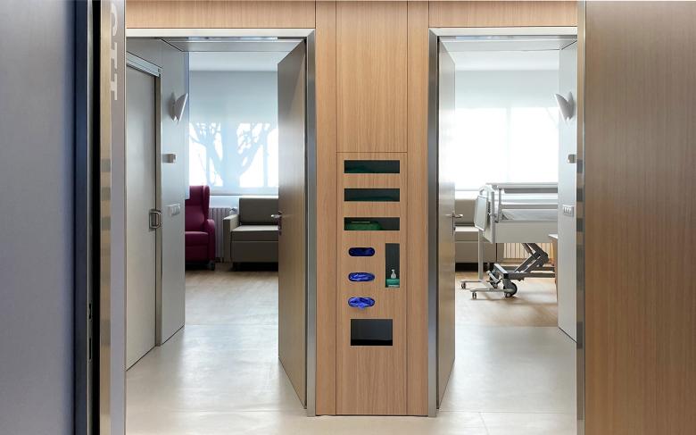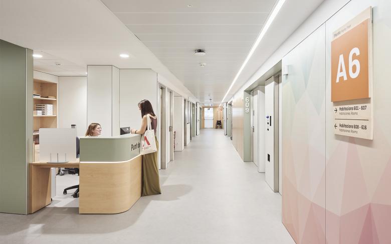 ·Maternity Area: The new maternity area, located on the 6th floor of the hospital, was born from the desire to improve spaces and the experience of families. The central corridor is the backbone of the area, which has 16 individual rooms with bathro-oms. The rooms have been designed with natural materials and colors to favor the calm of the space, complemented by a wall with cheerful colors, and comfortable furniture ele-ments. The windows have been extended to the pavement, increasing the exterior views and the entry of natural light from all points of the room. The corridor follows the same design line, combining white and green colour, wood, and integrating the signage of the entire unit. The staff spaces are located in the central area and have been designed for their needs and comfort.