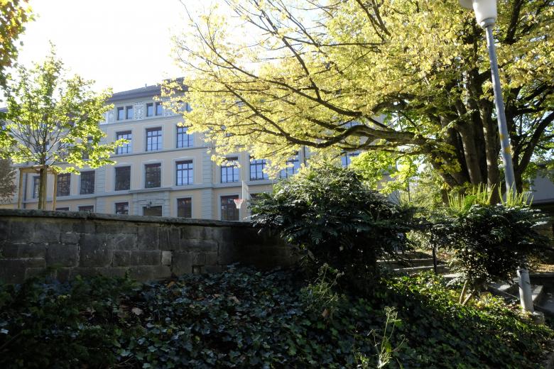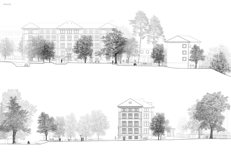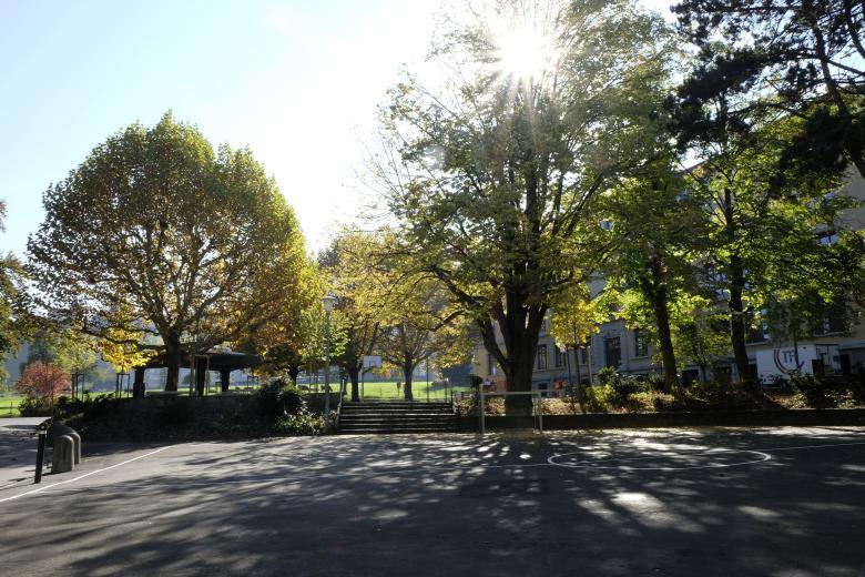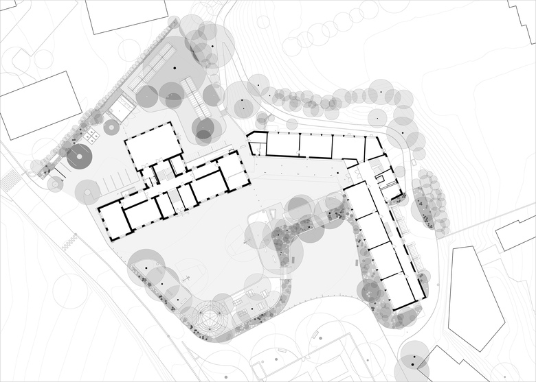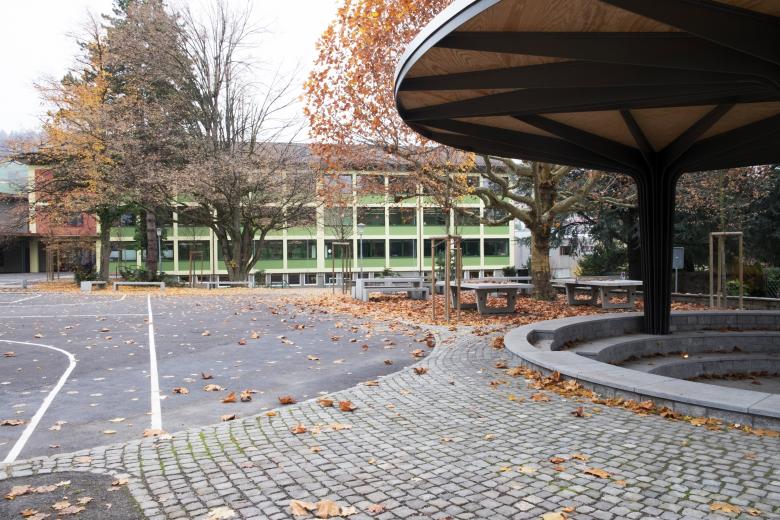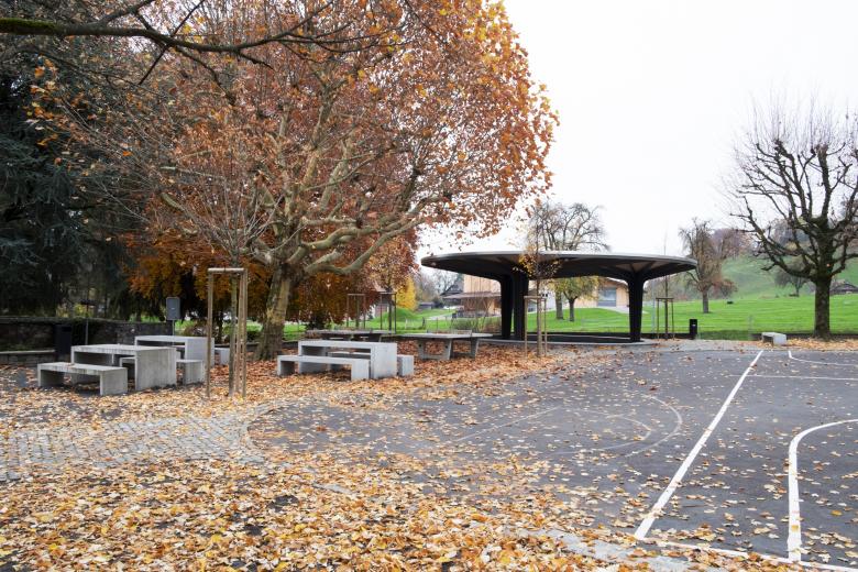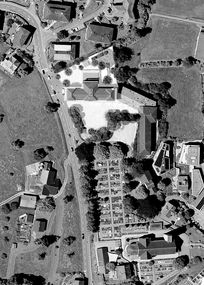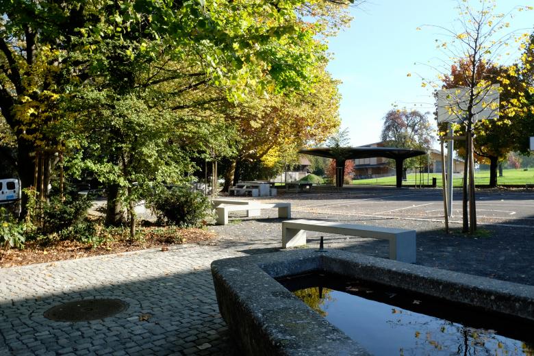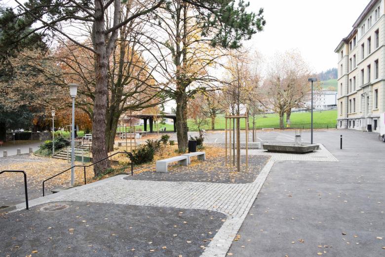 Die Schulanlage Kirchbühl beherbergt mit dem klassizistischen Schulhaus aus dem Jahre 1900 ein schutzwürdiges Kulturdenkmal von erheblichem Wert. Seine markante Stellung im Quartier wirkt zusammen mit dem Erweiterungsbau aus dem Jahre 1955 stark raumbildend. Das Ensemble ist zusammen mit Pfarrkirche und Friedhof stark ortsprägend und identitätsstiftend. Die heute bestehende Umgebungsgestaltung weist Elemente von guter Qualität auf. Der konzeptionelle Kern der Anlage aus den 70er Jahren ist noch erkennbar, obwohl die Umgebungsqualität aufgrund späterer Umbauten erheblich gelitten hat. Im laufe der Jahre hinzu gekommene Nutzungen wie Parkplätze verstärken diesen Effekt zusätzlich. Die Schulhöfe weisen einen teilweise erhaltenen Baumbestand auf. Natursteinmäuerchen, Plätze und Treppen zeigen die ursprüngliche Konzeptabsicht der Anlage auf. Das Freiraumkonzept baut darauf auf, indem es mit präzisen Eingriffen störendes auflöst, das Gute bewahrt, freistellt und darauf basierend die Freiräume weiterentwickelt. Grosszügig geschwungene Kiesflächen strukturieren die bestehenden Asphaltbeläge, bilden gute Bedingungen für zusätzliche Baumpflanzungen und generieren damit Aufenthaltsorte mit spezifischen Qualitäten. Auf diesen versickerungsfähigen Flächen werden die Nutzungen verdichtet und neu organisiert (Sitz- und Spielbereiche, Brunnen, Pavillon mit Arena, Abstellflächen für Velos). Der hintere Hof wird geprägt von einem kleinen Ahornhain mit spektakulärer Herbstfärbung. Die Pausenplätze auf der Vorderseite zum Friedhof werden durch Platanen, Föhren und Linden strukturiert und beschattet.