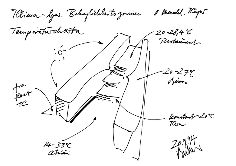 Das raumhohe Atrium, gestaltet nach Art eines städtischen Außenraums, zieht sich in einer einzigen langsamen Bewegung durch die volle Länge des Hauses: von der raumhohen gläsernen Nordwand über einen Stufenberg von Terrassen – unter denen geschützt das Rechenzentrum für die Gasversorgung der ostdeutschen Bundesländer liegt – bis hinauf zur Südwand mit dem Restaurant, wo die oberste Terrasse von innen nach außen auf das Dach des Hauses führt. Neben diesen Orten bieten auch die Brücken zwischen den Büroflügeln reichlich Gelegenheit zu informeller Kommunikation.
