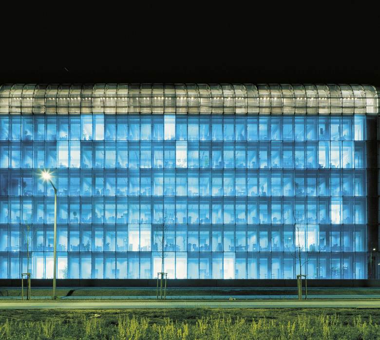Das Verwaltungsgebäude und das Rechenzentrum als die Hauptteile des Raumprogramms sind nicht allein organisatorisch, sondern auch energetisch, das heißt in Bezug auf Heizung und Kühlung, miteinander verbunden. Die für das Rechenzentrum benötigte Energie wird vor Ort durch mehrere Blockheizkraftwerke produziert. Bei der Formgebung des Gebäudes spielte die Thermik des Atriums eine große Rolle; der Luftstrom wird sommers für die Auskühlung, winters für die Erwärmung genutzt. Barocke Synästhesie, Auflösung der Erscheinung des Stofflichen, Einheit von Kunst und Bau: Auf diese Wünsche der Architekten ließ sich James Turrell mit seinem Lichtkunstwerk ein. An der Nordseite des Gebäudes tritt ein Rechtkant mit drei Seiten aus einem der beiden Riegel. Dieser Bauteil dient Konferenzen. In die Außenkanten der Geschossdecken sind Neonröhren integriert. Digital programmiert, können sie die Lichtfarbe allmählich verändern und den Kubus in sehr differente Atmosphären tauchen.