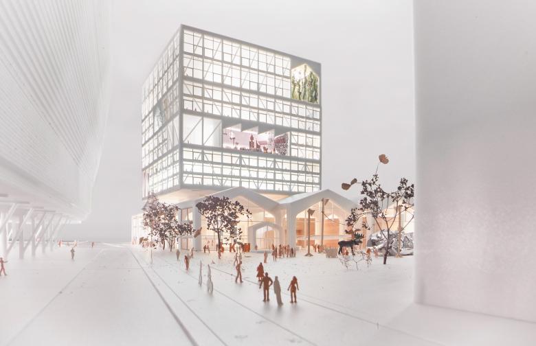 The new performing arts school invites for a joint creation, artistic curiosity and an open dialogue. The building becomes a contemporary addition to the characteristic industrial landscape of the Slakthusområdet district, creating a bridge between history and future, the site-specific and universal. The proposal is a transparent interpretation of the surrounding industrial warehouses combined with stage design structures, promoting new standards for creative learning by making the artistic process transparent, where rehearsal rooms and public spaces become a unified experience.