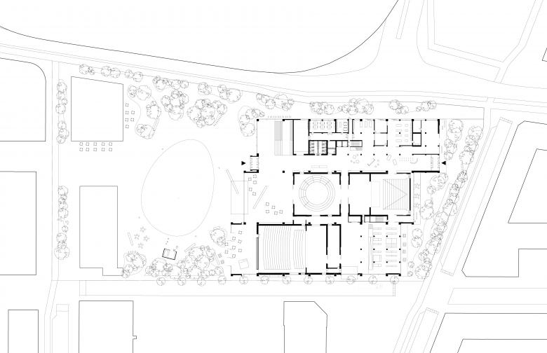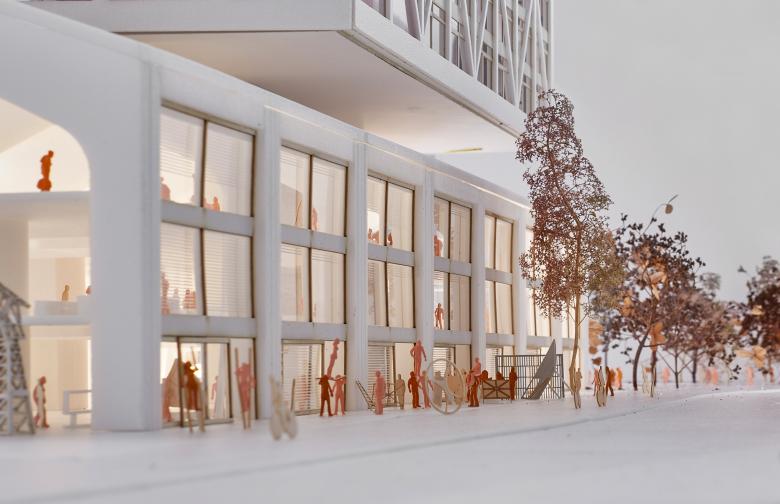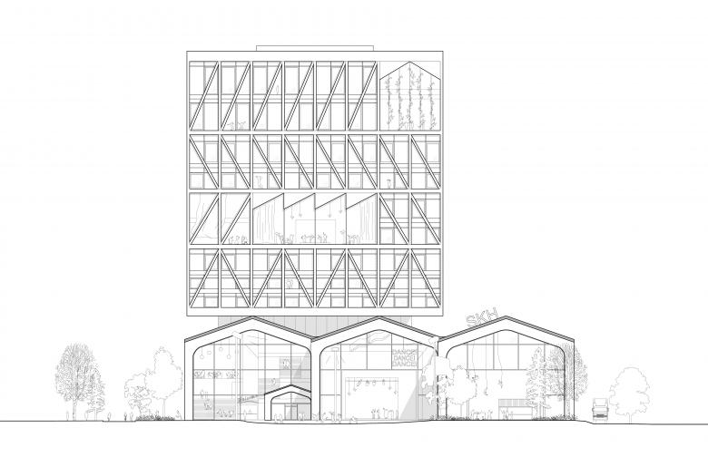 The transparent foyers of the school act as spaces for open rehearsals and performances where the stage can open up to the city as well as the rest of the school. The facades are fitted with large industrial doors to access stage workshops and foyers to allow for activities to move outdoors to the street. The massing of the building steps down towards the square to create a forecourt that can be used as a combined stage, workplace and a dining area.