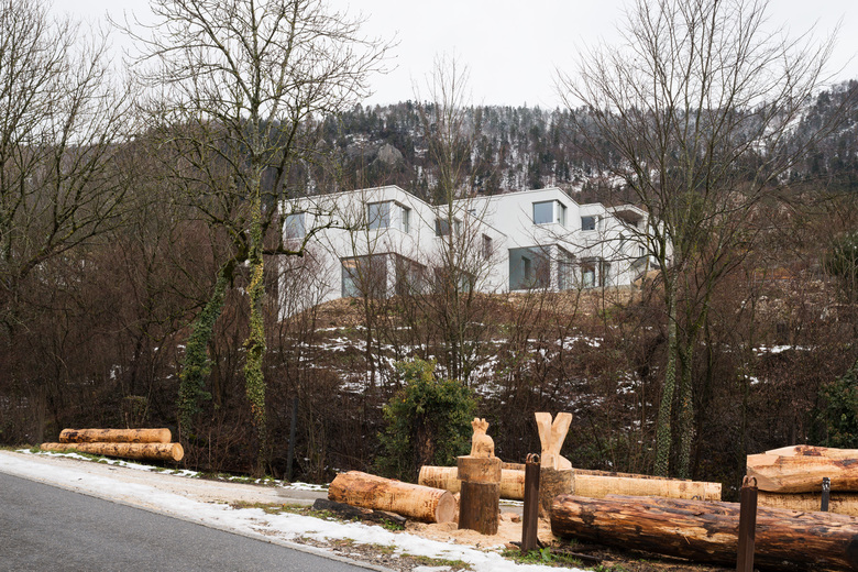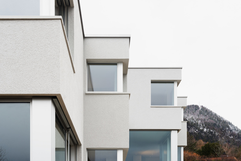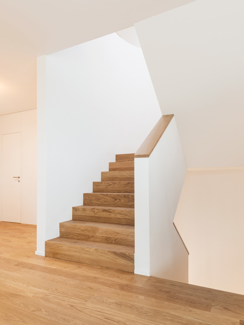 Die beiden Wohnhäuser am Hang in Oberdorf erstrecken sich in ihrer ortstbaulichen Setzung von Norden nach Süden, entlang der steilabfallenden Topografie des Grundstücks. Wie in der Horizontalen werden die einzelnen Gebäudesegmente auch in der Vertikalen abgestuft und innerhalb des geforderten Grenzabstandes auf ein Maximum aufgespannt. Das hat einerseits zur Folge, dass sich die Volumetrie nach Süden öffnet und spezifische Ausblicke zum Alpenpanorama gewährleistet werden. Andererseits wird das Gebäude im steilen Hang empirisch verankert. Die Grundrisstypologie folgt einem mäandrierenden Raumkontinuum welches durch unterschiedliche Raumhöhen und Abstufungen subtil unter den einzelnen Raumnutzungen unterscheidet. Die Materialisierung erfolgt in haptisch hochwertigen Materialien. So tritt die verputzte massive Einsteinfassade in ihrer Farbigkeit in Bezug zum umliegenden Jurakalkstein der Region Jurasüdfuss.