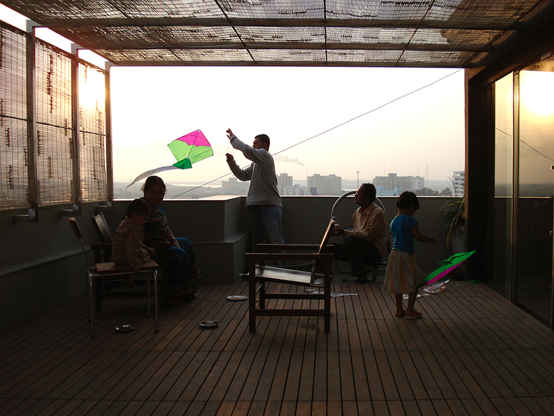 The choice of Stainless Steel, Wooden slats and Bamboo chicks as the core architectural elements became obvious as we set out a brief to have a terrace garden that takes less time to maintain and gives more time to entertain self and others. The amalgamation of these urbane and rustic materials create a space that filters the sunlight through porous Roof; provides privacy through Screens; frames scenic vistas of the glistening river, open fields and sprawling city through raised Deck; and ensures healthy growth of plants through elevated Racks for the pots. All this while one sits down and takes in the fresh breeze from Arabian Sea and River Tapi.