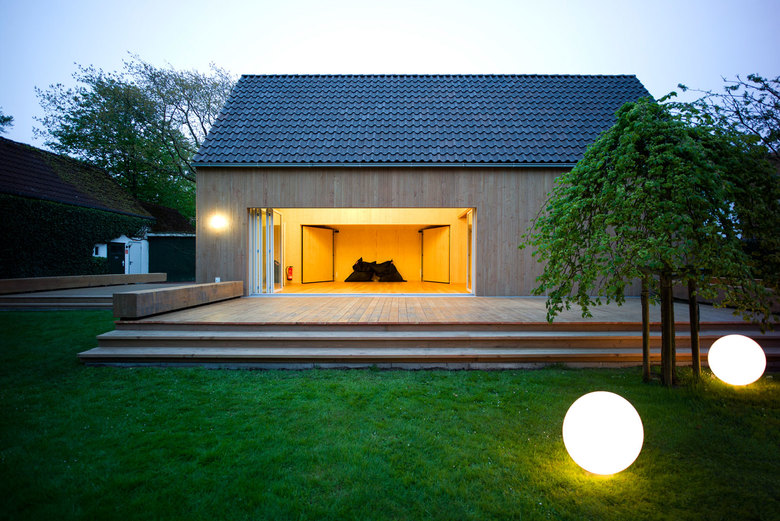 Städtebau und Gestalt – Das Holzhaus bleibt in Kubatur und Fassaden zurückhaltend und schlicht. Die großzügigen Öffnungen mit vorgelagerten Terrassen verknüpfen Innen und Außen.