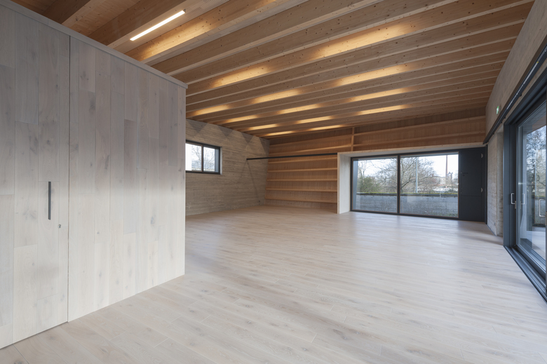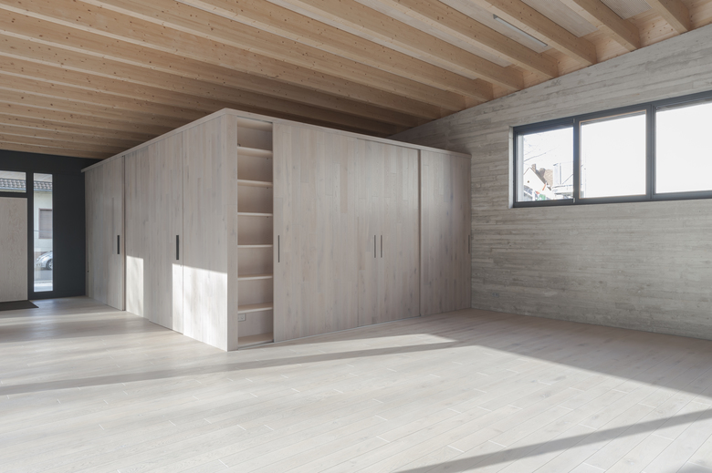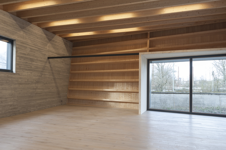 Material und Farben - Die konstruktiven Betonwände und die Zimmermanns-konstruktion bestimmen durch ihre Materialität den Raum. Boden und Kubus aus gleichem Holz erzeugen eine ruhige Atmosphäre.
