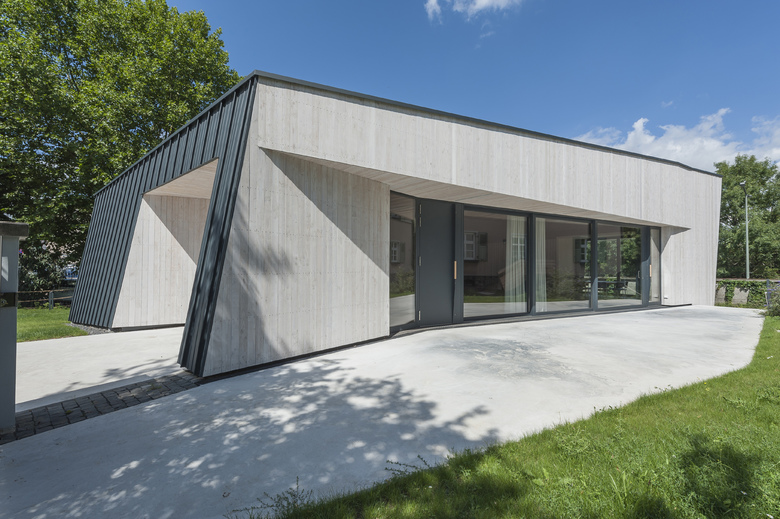 Im eingestellten Kubus befinden sich die Nebenräume. Die großen Schiebelemente und die vorgelagerte Terrasse stellen die Verbindung zum Kirchenensemble her.