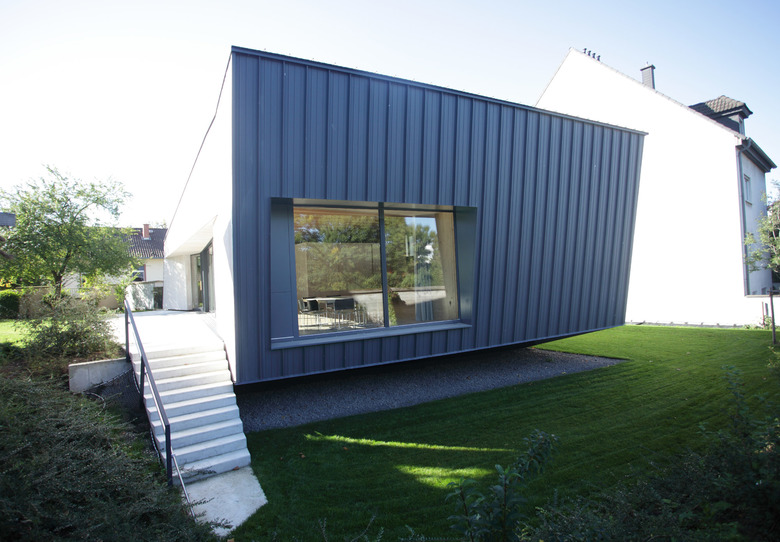 Die Metallfassaden im Süden, Westen und Norden nehmen in ihrer Farbe die grossen Schieferflächen der Dächer auf und rahmen die leichte Ostfassade aus Holz.