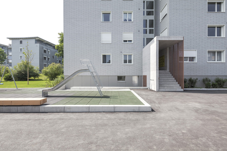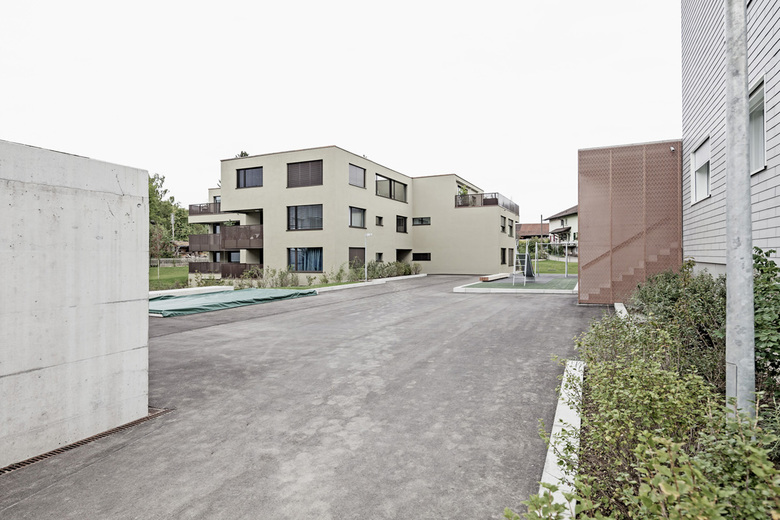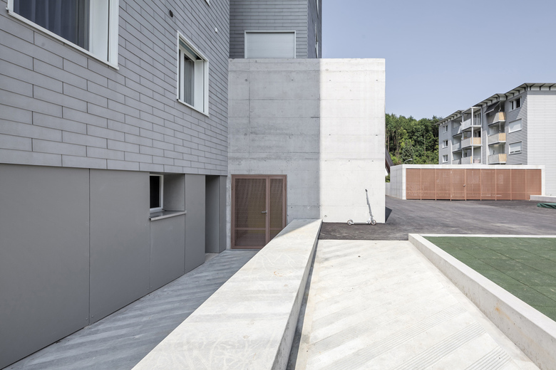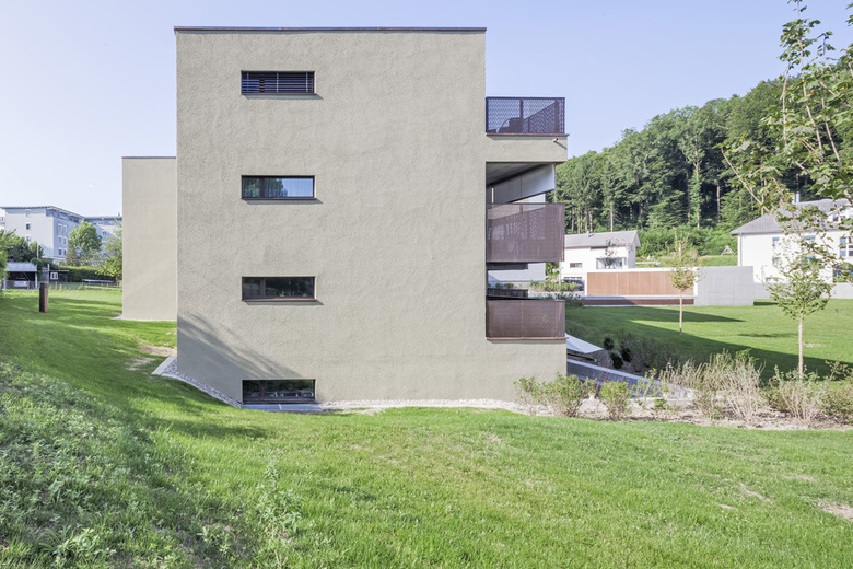 Die vorgeschlagene Typologie des Neubaus orientiert sich geometrisch am unmittelbaren, orthogonalen Bebauungsmuster und bildet mit ihm ein harmonisches Ensemble. Drei zweigeschossige Arme mit Attika greifen in die Umgebung aus und nehmen den Parkcharakter auf. Bewusst wurde die mögliche Gebäudehöhe nicht voll ausgenutzt. Dadurch übernimmt das neue Volumen die Vermittlung zwischen den grossen Mehrfamilien- und den Einfamilienhäusern. Die Anordnung generiert drei Wohnungen pro Geschoss, welche dreiseitig belichtet sind. Die Dachfläche lässt zwei Attikawohnungen mit grossen Terrassen zu. Eingezogene Loggias gliedern das Gebäude und garantieren allen Einheiten einen privaten, gedeckten Aussenraum. Eine langgezogene, natürlich belichtete und belüftete Einstellhalle erschliesst sowohl den Neubau als auch das sanierte Mehrfamilienhaus Moosburgstrasse 25. Zwei markante Mauerscheiben akzentuieren den Tiefgarageneingriff im Aussenraum. Die eine beim Zugang in Kombination mit dem Veloständer, die andere als Stütz- bzw. Sitzmauer beim Terrainsprung. Die übrige Umgebung wird analog dem vorhandenen Konzept weitergeführt: fliessende Rasenflächen werden von einem geometrischen Wegnetz durchkreuzt und mit Einzelbäumen bestückt. Auf der Tiefgarage wird ein Siedlungsplatz mit Spielmöglichkeiten angeboten. Unterschiedliche, kräftige Strukturen und Rauheiten im Putz gliedern die Fassade und verleihen dem Haus einen charakteristisch eigenständigen Ausdruck. Grosse Fensterflächen mit schmalen Lüftungsflügeln belichten alle Räume. Analog der raumgreifenden Figur des Gebäudes sind die einzelnen Wohnungsgrundrisse entwickelt. Klassische, introvertierte Zimmer werden so gelegt, dass sie ein Raumkontinuum bilden, welches in drei Himmelsrichtungen ausgreift. Es entstehen je eine 2.5-, eine 3.5- und sechs 4.5-Zimmer-Geschosswohnungen. Die Einheiten eignen sich sowohl als Familien-, Zweierhaushalt- oder Singlewohnungen. Die einzelnen Zimmer sind durch die beinahe quadratischen Grundrisse nutzungsneutral und gut möblierbar. Die bestehenden 60 Wohnungen mit Baujahr 1969, werden mittels feiner Eingriffe aufgewertet. Präzise räumliche Verbindungen zwischen Küchen und Wohnräumen schaffen attraktive Bezüge und optimieren die internen Abläufe. Die Qualitäten der kleinräumigen, bestehenden Strukturen werden mit Hilfe von subtiler Farb- und Materialwahl gesteigert.