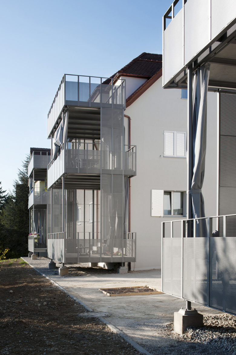 Die Ende der 1920-er Jahre erstellte Arbeiterwohnsiedlung befindet sich in einem vom Zeitgeist der Zwischenkriegszeit stark geprägten Quartier. Schützenswerte Qualitäten sind die homogene, charakteristische Bebauung und eine einst der Selbstversorgung dienende starke Durchgrünung. Diese sollen mittels einer Quartierschutzordnung erhalten werden. Für eine nachhaltige Entwicklung des Wohnquartiers ist jedoch eine Anpassung an die heutigen Bedürfnisse zu erreichen. In bescheiden geschnittenen 3- und 4-Zimmer Wohnungen werden mittels zusätzlicher Raumverbindungen, Küche, Wohn- und Essraum analog einer Enfilade angeordnet. Den Bewohnern wird somit nebst der funktionalen, kleinzelligen Wohnstruktur, auch eine grosszügige Abfolge fliessender Wohnräume angeboten. Im Innern soll das stimmige, kleinbürgerliche Ambiente durch das sorgfältige Auffrischen und Ergänzen der klassischen Materialisierung erhalten, beziehungsweise wiederhergestellt werden. Türen, Fenstereinfassungen, Lamperien und Zierleisten aus Holz werden in sanften Mélangefarben von den weissen Wänden abgesetzt und prägen mit den naturfarbenen Eichenböden die wohnlich warme Farbigkeit. Die neuen, profilierte Doppelflügeltüren fügen sich selbstverständlich ins Intérieur ein und ermöglichen die Erlebbarkeit unerwartet grosser Raumtiefen in der Wohnung. Der Umgang mit den veränderten äusseren Proportionen, die aus der energetischen Sanierung der Gebäudehü̈lle resultieren, führte zu einer zeitgemässen Interpretation der bestehenden klassischen Fassadengliederung. Die Aussenhaut ist mit unterschiedlichen, abgegrenzten Putzstrukturen materialisiert und wird auch stark von den neuen Metallfensterläden geprägt. An die Häuser werden südseitig leichte, laubenartige Metallkonstruktionen gestellt. Die Bewohner können sich auf korbartigen, mit Metallgeflechten geschützten Balkonen in die neu gestaltete, grüne Umgebung setzten. Die bestehende Bepflanzung des üppigen Grünraums wird in das neue Umgebungskonzept integriert. Die Häuser werden auf grossen Kiesteppichen zusammengefasst und die Siedlung erhält mit einer Heckenbepflanzung einen neuen äusseren Abschluss. Über grosszügige, mit hängenden Kletterpflanzen bewachsene, ellipsenförmige Treppenabgänge, ist die mit neu erstellte Autoeinstellhalle mit der neuen, äusseren Wegführung verbunden.
