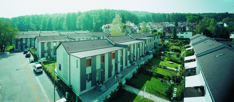 Die Siedlung besteht aus acht parallel stehenden, von Südwest nach Nordost in der Höhe abgetreppt verlaufenden Längsriegeln mit sechs mal acht und zwei mal sechs Reiheneinfamilienhäusern. Diese Riegel bilden und begrenzen die klaren, langgezogenen Aussenräume der Siedlung. Die charakteristische Qualität der Aussenräume bleibt im Erweiterungsprojekt erhalten, da vor die bestehenden Reiheneinfamilienhäuser auf die ganze Länge der Baukörper eine neue Schicht gestellt wird.