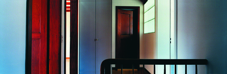 Diese Strategie zeigt sich beispielsweise bei den braun lasierten Holzbalken und den Fenstereinfassungen, welche belassen werden als prägende Charakteristika des Hauses. In den Zimmern hängen wieder Tapeten. Bei den Fenstern im Altbau bleiben die alten Rahmen und Einfassungen, die Fensterflügel aber werden ersetzt mit wärmetechnisch besseren Gläsern. Die Fensterbeschläge im alten Teil sind nach Vorgabe der ehemaligen Beschläge erneuert, im neuen sind moderne angebracht. Im alten Hausteil hängen Jalousieläden aus Holz, im neuen Faltläden aus braunem Sperrholz. Die ehemaligen Aussenfenster im Obergeschoss sorgen neu im Übergang zwischen alter und neuer Hausschicht für Licht und Transparenz in Bad und Korridor. Die alte Haustüre hängt auch im erweiterten Haus da, wo sie immer war.
