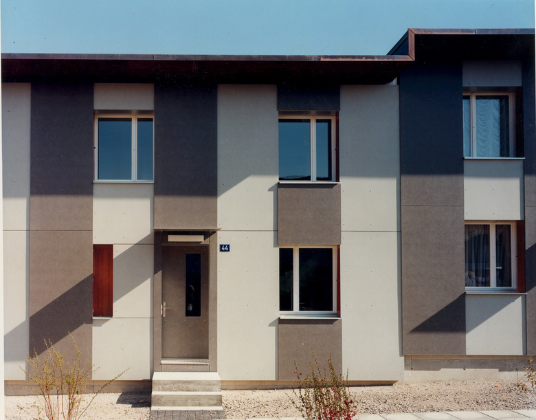 Die neuen Fassaden sind wie die der alten Siedlung einfach in der Rhythmisierung und glatt. Unterschiede manifestieren sich in der Wahl der Materialien und der Konstruktion sowie in der Proportionierung und Gestaltung der Fassaden: die alte Fassade war eine tragende, verputzte Holzständerkonstruktion, bei der neuen thematisieren die geschichtet versetzten Eternitplatten, dass diese Fassade keine tragende statische Funktion hat, sondern nur als schützende Wetterhaut dient.