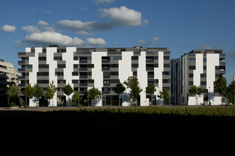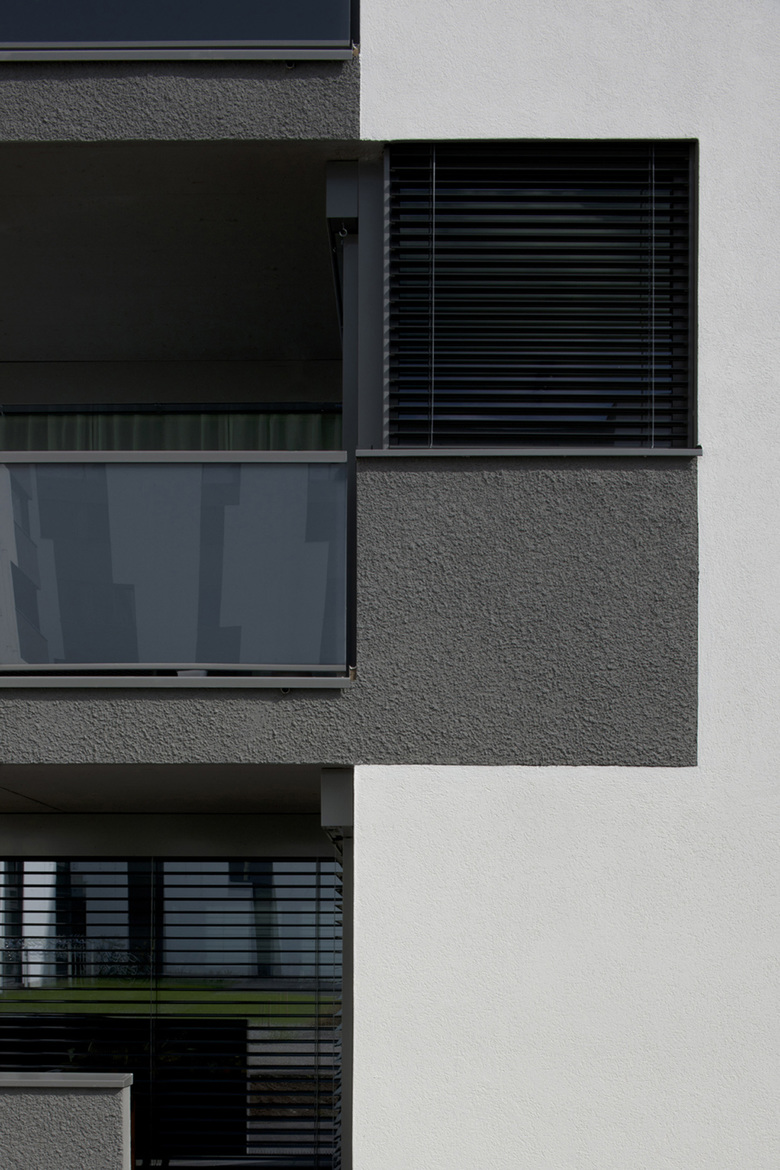 Die Umgebungsgestaltung der Wohnbauten bezieht sich mit Ihrer Gräserlandschaft auf die ursprünglichen Riedwiesen. Auf der Hoffläche über der Tiefgarage wechseln sich vielfältige Elemente wie Grünzonen, mit Blumenzwiebeln angereicherte Kiesflächen und gebundene Beläge ab. Die Putzfassaden nehmen das murale Umfeld auf. Die farblich klar abgegrenzten, kubischen Felder sind in Körnungen von ganz fein bis sehr grob verputzt. In den dunkelgrauen, rauhen Flächen sind Fenster in unterschiedlicher Grösse versetzt angeordnet, um die Wohnungen zu individualisieren. Die Loggiaverkleidungen sind aus transluzentem Grauglas. Die weissen Bänder sind glatt wie geschliffene Steine und prägen den Innenhof durch die vertikalen Fassadenbegrünungen mit üppig blühenden Glyzinien. Das Farbspiel mit den Grün- und Brauntönen der hohen Gräser verbindet die Fassaden mit dem Aussenraum.
