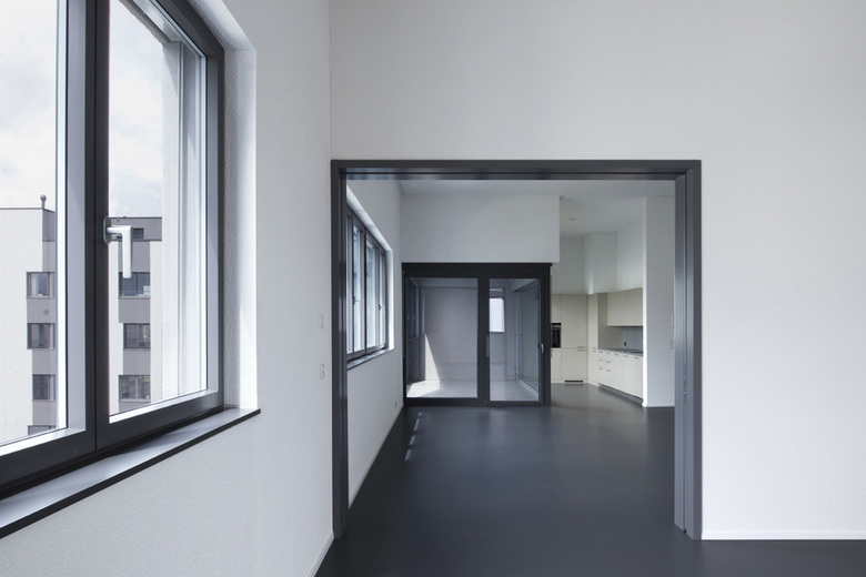 Die Gebäude mit bis zu sechs Vollgeschossen verfügen über 2.5- bis 4.5-Zimmer-Wohnungen, deren Grundrisse sich durch spezielle Zuschnitte auszeichnen und so auf die jeweilige Situation differenziert reagieren können. Das kompakte Haus A und das langgezogene Haus B enthalten Mietwohnungen. Im ökonomischen Vierspänner sind die Einheiten um einen einzelnen Kern angeordnet, liegen aber im Splitlevel halbgeschossig zu einander versetzt. Die Kleinwohnungen sind alle mindestens zweiseitig orientiert und bieten dank dem offenen Wohnraum mit grosszügigem Balkon eine hohe Wohnqualität. Im 5. Obergeschoss überraschen die Hofwohnungen mit einer Raumhöhe von 3.5 Metern. Im Längsbau sind die Wohnungen diagonal organisiert. Insbesondere in den öffentlicheren Teilen entstehen fliessende Wohnlandschaften. Als Ausnahme liegt das kleine Studio einseitig, profitiert aber von viel Fassadenfläche.
