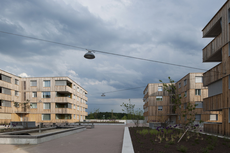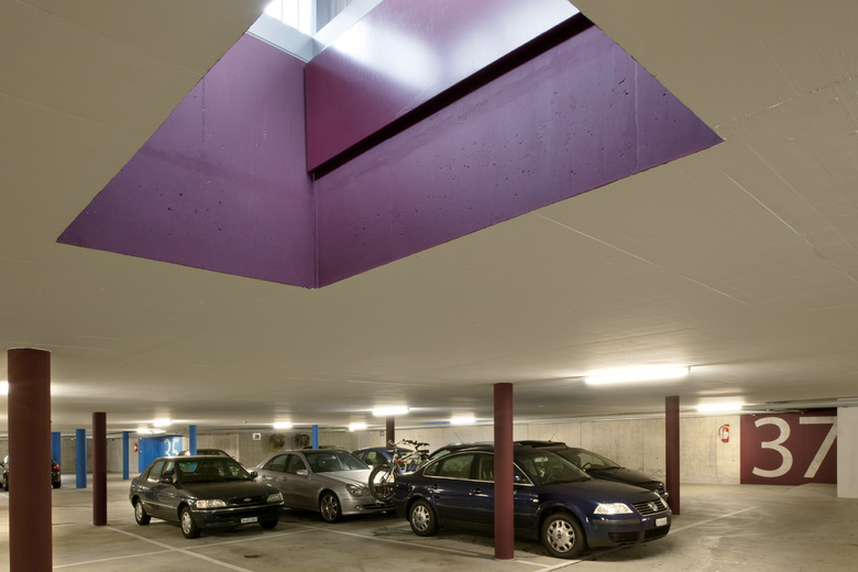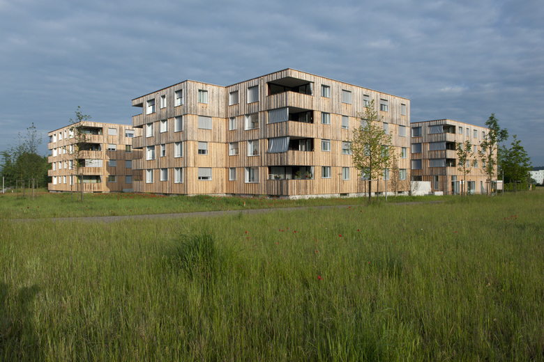 Die Siedlung ist über unterschiedlich ausgebildete Wegstränge in alle Richtungen mit dem Umfeld verbunden. Der Hauptzugang führt von der Feldhofstrasse über eine breite Freitreppe auf das erhöhte Siedlungsplateau über der Einstellhalle mit 79 Stellplätzen. Der zentrale Platz mit einem angelagerten Kleinkinderspielbereich ist freigehalten und bildet als vielfältig nutzbare Fläche die soziale Mitte der Wohnsiedlung. Blühende Strauchkissen in aufgesetzten Pflanzflächen wirken als stimmungsvoller Filter zu den Wohnungen im Erdgeschoss. Die Aussenräume zum Familienzentrum und zumm Gemeinschaftsraum sind den Räumen direkt zugeordnet und mit aufgelockerten Heckenbändern gefasst. Frei gestreute Bäume auf der Parkebene überspielen die offenen Parzellengrenzen. Die Fassade aus unbehandelten, unterschiedlich breiten Weisstannenlatten versilbert sich mit dem Alter und schafft eine Verbindung zwischen Stadt und Natur. Vor den Treppenhausfenstern wird das Fassadenkleid aufgelöst und gibt dadurch die dahinter liegenden, farbigen Glasflächen preis. Die vier Mehrfamilienhäuser öffnen sich an den Innenecken und geben unter einem Vordach den Zutritt frei. Das zentrale Treppenhaus im Innern der Drei- und Vierspänner ist schlicht in Sichtbeton gehalten und bietet pro Etage eine aus der Wand kragende Sitzbank zum Verweilen an. Verschiedenfarbige Flächen in Form aufgesetzter Wohnungstüren weisen zu den Wohneinheiten. Die Erschliessung der 2.5- bis 4.5-Zimmer-Wohnungen erfolgt über eine grosse Halle, von welcher man in alle Räume gelangt: durch eine breite Flügeltür betritt man den Wohn-Essraum mit anliegender Küche und über eine Vorzone die privateren Zimmer. Von der grossen Loggia wird der Weitblick in den Naturraum bis zu den Glarner Alpen ermöglicht. Hier sind die Fensterfronten und Wandpaneele mit farbig eloxiertem Aluminium versehen. Pro Wohnungsstrang führt eine spezifische Farbgebung von der Eingangstüre über das Entree durch die Bäder und rundet das Konzept der Gesamtanlage in der Loggia bis in den Aussenraum ab. Die Raumfolge Wohnraum-Küche-Loggia wiederholt sich in allen Wohnungen und wird so zum bestimmenden Merkmal der Siedlung.