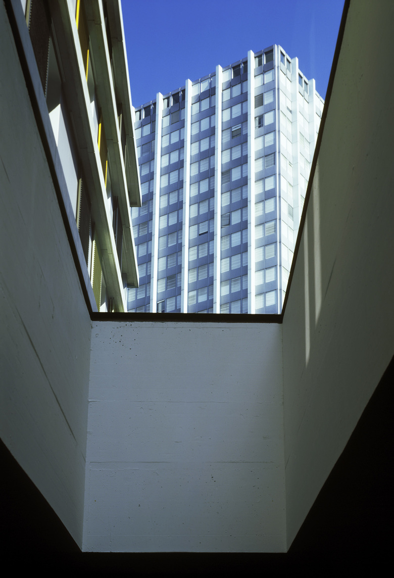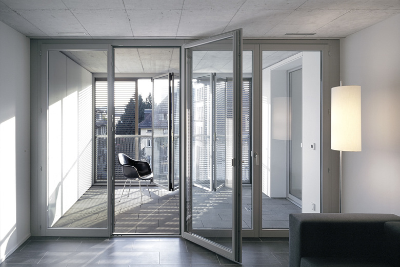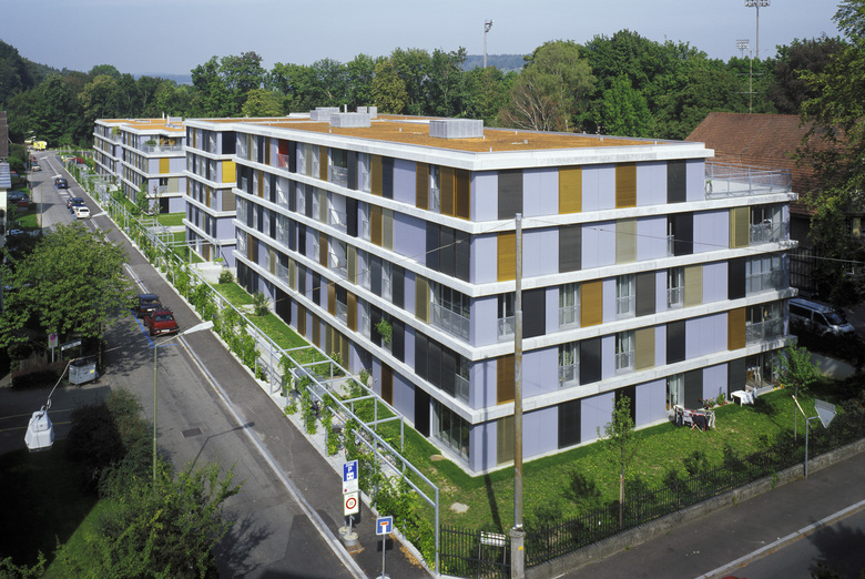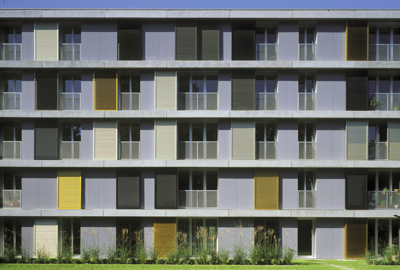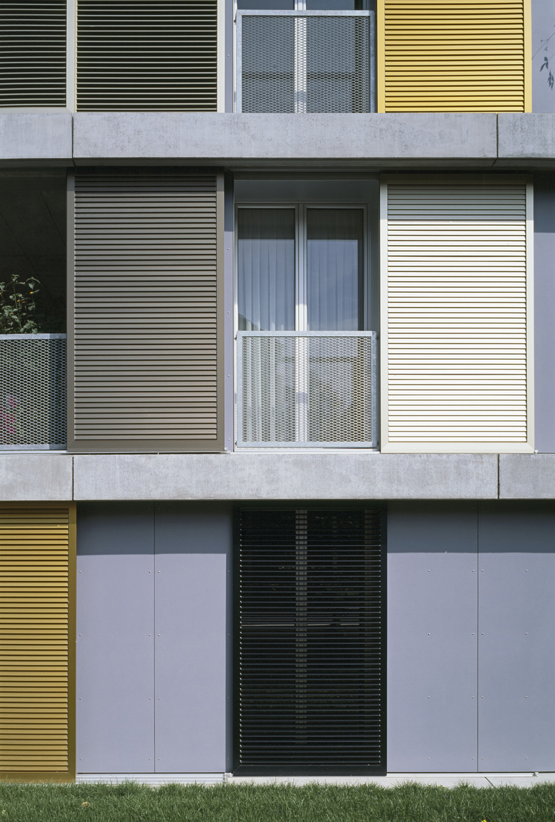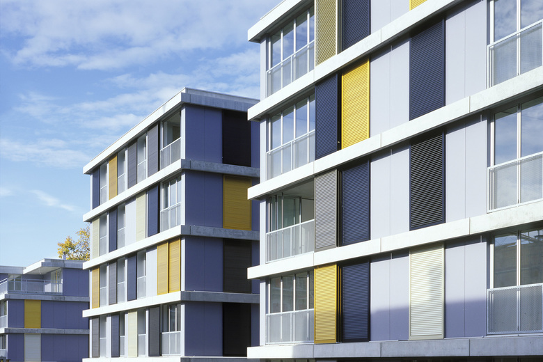Schiebbare Fassadenelemente aus verschieden farbig eloxiertem Aluminium vor den raumhohen Fenstern und den Loggias dienen zur individuellen Lichtregulierung und Schliessung. Durch das von den Bewohnern bestimmte Spiel mit den beweglichen Fassadenelementen wird sich die im Grundsatz stringent und regelmässig aufgebaute Fassade nie gleichförmig präsentieren. Die umlaufenden Gesimse im Bereich der Geschossdecken betonen die Gesamtfigur aller vier Baukörper.