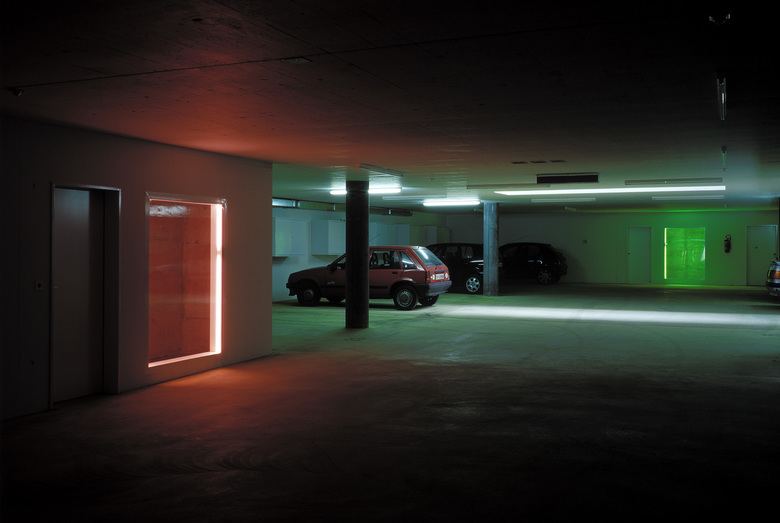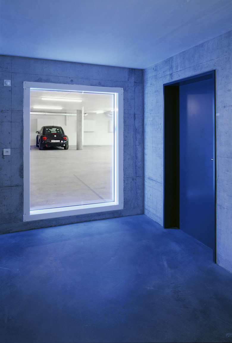 Die Tiefgarage als der grösste Raum in der gesamten Überbauung ist speziell gestaltet mit farbigen Lichtquellen und einem durchgehend gelb eingefärbten Betonboden. Die Aufgänge zu den Häusern sind mit unterschiedlich farbigem Licht betont.