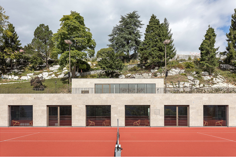 Die Gebäudeteile sind symmetrisch, um einen zentralen Außentennisplatz, organisiert. Zwei identische Tennishallen mit kristallförmigen Dächern begrenzen den Platz an dessen Querseiten. Ein Clubhaus mit Bar, Garderobe und Rezeption bildet den Abschluss an der bergzugewandten Längsseite. Von der Konzeption der historischen Anlage abweichend, bei der das Clubhaus an der Straße lag, wurde es unter die Straße verlegt und erschließen es vom Straßenniveau über einen Eingangspavillon. Die Servicestraße für Anlieferungen und das Parkhaus verstecken sie unter dem Platz und den Hallen, so dass die Spieler vom Verkehr nicht gestört werden.