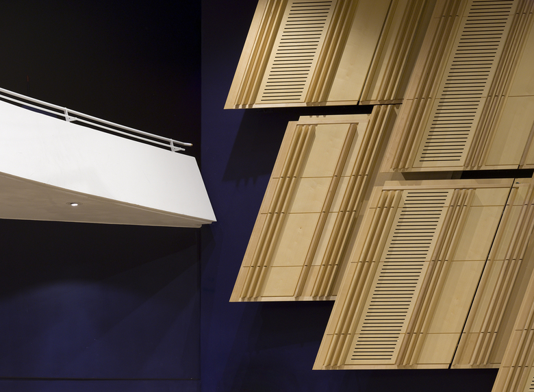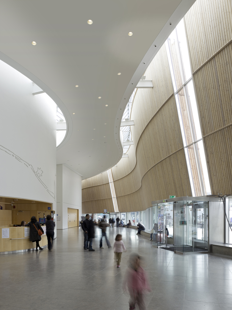 Daylight streams into the large foyer through roof lights and narrow oblong glass slits in the external screen. The foyer serves as an indoor public piazza for the city and is divided into separate areas by three free-standing geometric structures housing the main facilities of the Cultural Centre: a square box for the television studio, a triangular structure for the café and a circular form for the multi-purpose auditorium which has seating for 550 people and can also be used as a cinema or a concert or conference hall. The Cultural Centre of Greenland in Nuuk is a dynamic meeting place for Inuits from all over the northern hemisphere.