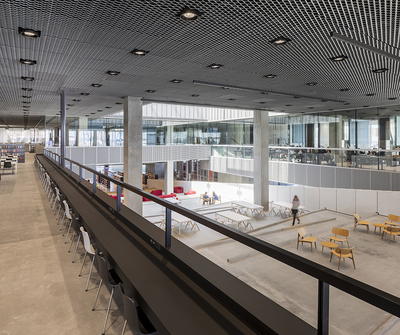 Democratic, open and diverse/The polygonal top floor contains the municipal administration offices along with rental offices. The two open levels of the library are connected by the media ramp, which consists of five platforms, each dedicated to an activity: exhibitions, gaming, interactive workshops, reading and events. Combined with the literature and media sections, the media ramp offers a meandering path of activity through the building leading up to the children’s area on the top floor.