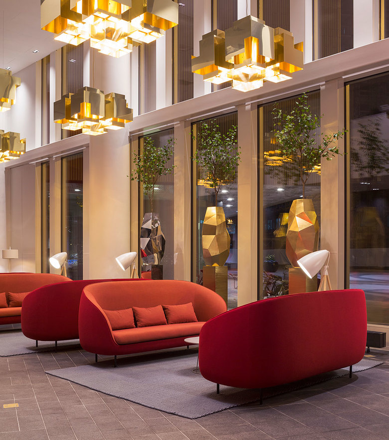 The main entrance is found at the northern part of the building, which has a classic loggia motif facing the plaza in front. From the south, visitors enter the building directly from the promenade running along the canal. The different functions of the building are organised as separate elements to resemble a small city. The lobby becomes the street, which runs through the entire ground floor and ties everything together. Like medieval cities, which had curved, narrow streets organised around plazas and squares, the lobby is designed to form small gathering places and recesses where visitors can stop, sit and enjoy the view of the canal and the park.