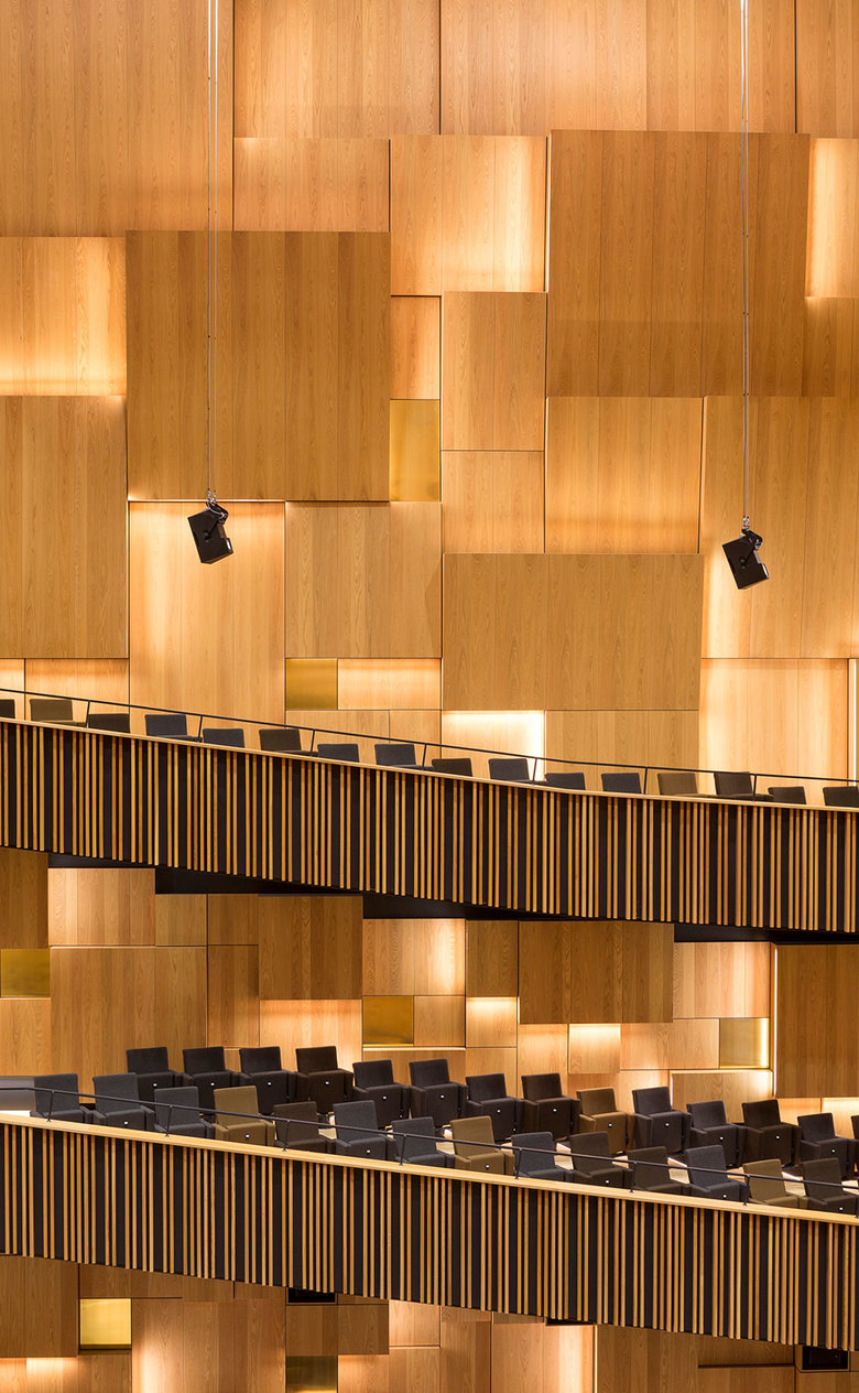 In the concert hall, the mood changes. The hall is an intimate space outfitted in oak and brass.