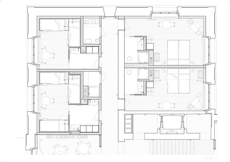 Die Unterbringung der Dienstwohnung im Dachgeschoss begünstigt diese mit etwas mehr Privatheit und spielt andererseits im Erdgeschoss ausreichend Platz frei um dort die in enger Beziehung stehenden Nutzungen wie Reception, Refectorium, Küche und Bar entlang der gesamten Südwest- bzw. Südostfassde unterzubringen. Ein inmitten dieser Nutzungen angeordnetes Backoffice ermöglicht es, auch im Betrieb mit wenig Personal den Überblick zu behalten. Das öffentliche Erdgeschoss erhält über die neue Terrasse auch einen adäquaten Bezug zum grossen Vorplatz.