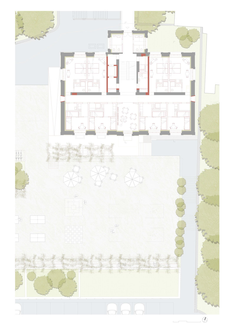 Die Einführung einer neuen raumhaltigen Schicht an den Flanken des Treppenhauses nimmt die Nasszellen mit dem Lift auf und ermöglicht die vollständig behindertengerechte Erschliessung des ganzen Hauses. Der neue Einbau der Gruppenzimmer (4-er und 6-er) auf der dem Platz zugewandten Gebäudeseite lässt Platz für einen Korridor, der auch die hangseitigen Zimmer erschliesst. Alle Zimmer sind auf die Fassadenöffnungen abgestimmt. Bis auf die neu eingeführten ovalen Fenster zur Belichtung des Korridors bleibt somit die ursprüngliche äussere Erscheinung des Gebäudes bestehen.