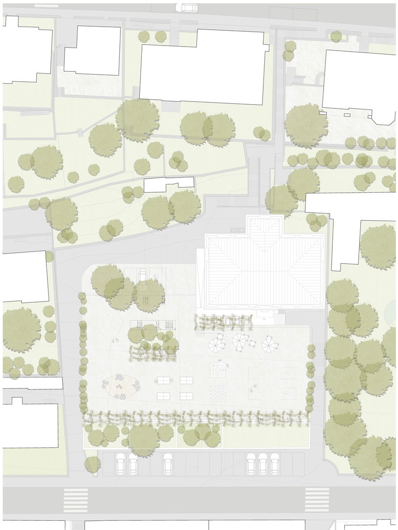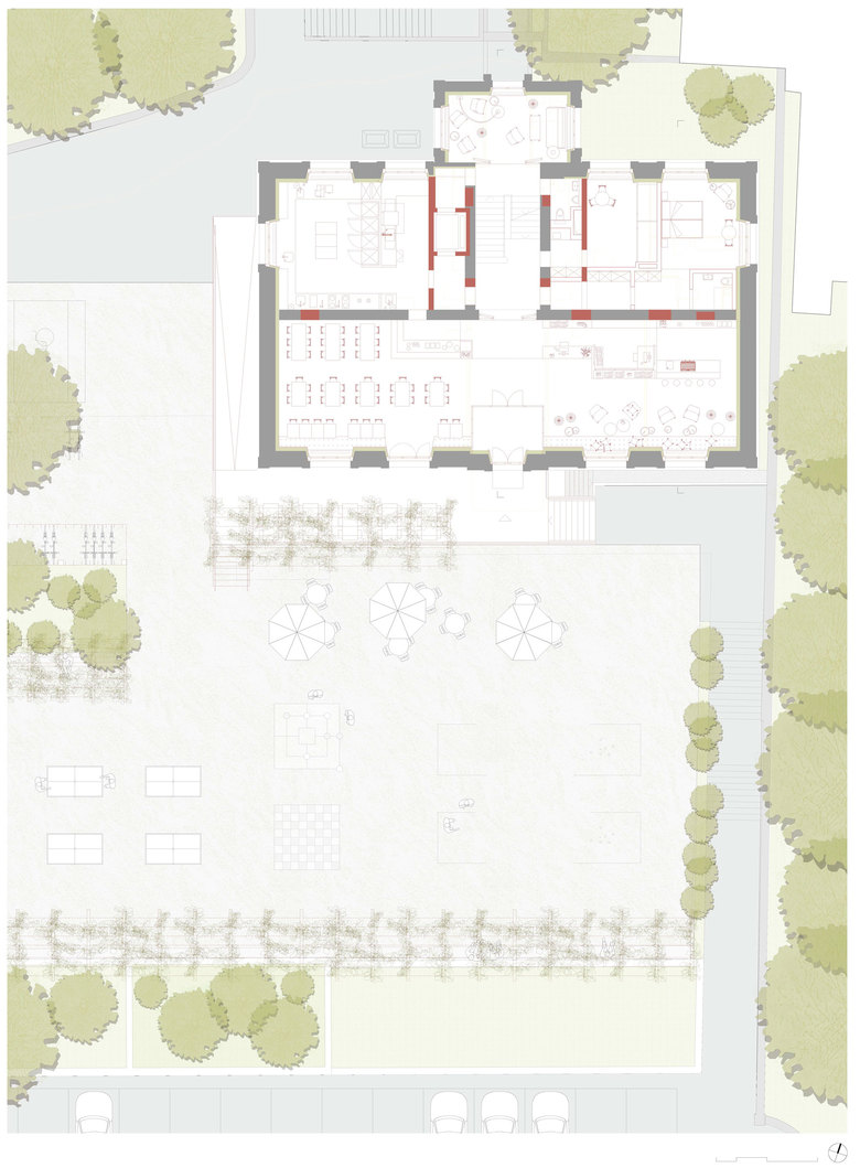 Der Entscheid den grosszügigen Freiraum um das bestehende Schulhaus zu würdigen mündet letztlich auch im Versuch, das Raumprogramm im Bestand unterzubringen und bis auf die vorgelagerte neue Terrasse mit Pergola auf einen Annex zu verzichten.