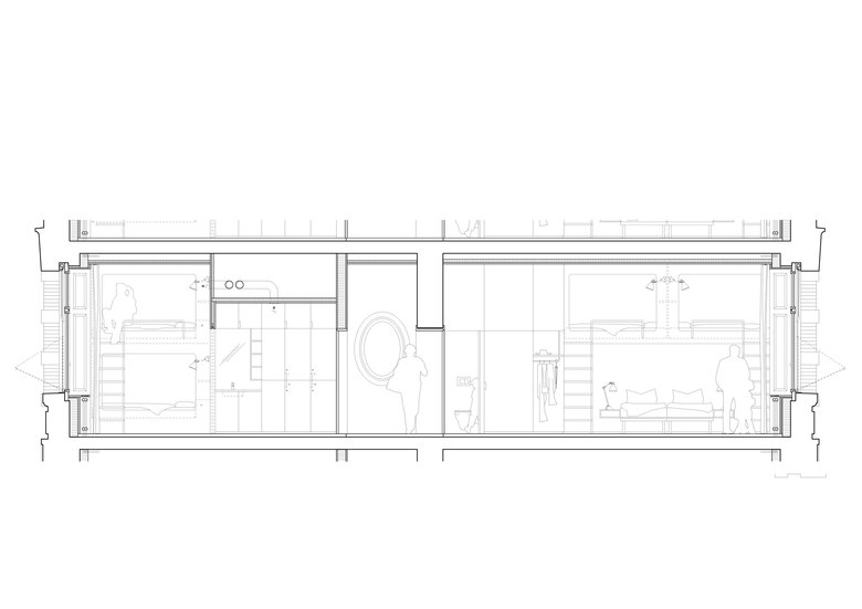 Der Frage der Privatsphäre in den Gruppenzimmern wurde besondere Beachtung geschenkt. Alle Zimmer werden durch einen Vorraum betreten, in dem die Wasch- und Staumöglichkeiten für die Gäste untergebracht sind. Eine Schiebetür schützt z.B. noch schlafende Gäste vor Licht und Lärm, den aufbrechende Gäste allenfalls bei der Morgentoilette oder dem Packen verursachen. Im eigentlichen Schlafraum sind die Betten in einer Raumhaltigen Schicht als Kojen ausgebildet, die sich so vom am ursprünglichen Fenster liegenden Zimmervolumen nochmals fein abgrenzen. Die WC-Anlagen sind geschlechtergetrennt auf zwei Halbgeschossen, bzw. für Behinderte auf dem Vollgeschoss untergebracht. Die Duschräume sind jeweils einzeln und geschlechterneutral über die Geschosse verteilt angeordnet.