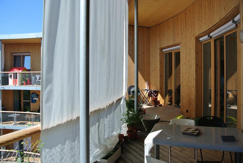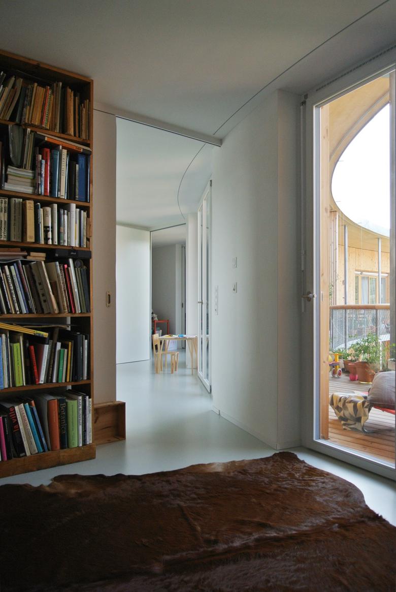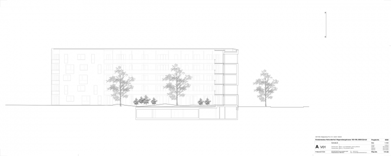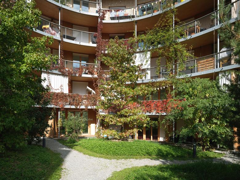 Das Gebäude besitzt zwei Gesichter: Zur Strasse hat das Gebäude einen städtischen Ausdruck mit einer robusten Materialisierung aus vorfabrizierten Betonelementen. Auf der Süd- und Ostseite ist das Grundvolumen aufgebrochen: Die eingeschnittenen Höfe strahlen mit ihrer Holzelementbauweise und dem hohen Fensteranteil Leichtigkeit und sommerliche Wohnlichkeit aus.