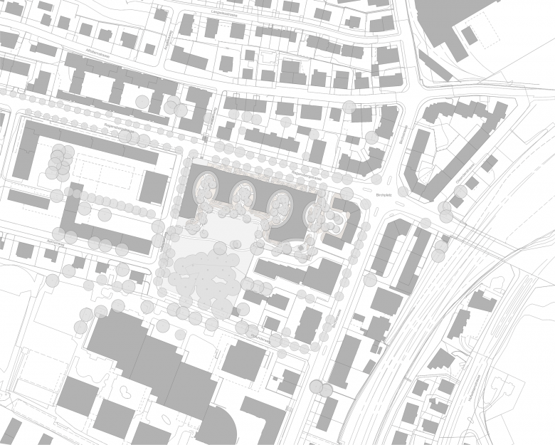 Durch die Gebäudeform entstehen unterschiedliche Freiräume mit grossem Potenzial. Im Süden, unmittelbar vorgelagert, entsteht durch die Verschiebung der öffentlichen Grünfläche im Verbund mit der kleinen Parkanlage eine zusammenhängende Grünfläche von beachtlicher Grosszügigkeit mit sehr schönem Baumbestand. Sie bildet die Kulisse für die Mehrheit der Wohnungen und ein attraktiver Quartiertreffpunkt liegt ihnen zur temporären Aneignung quasi zu Füssen.