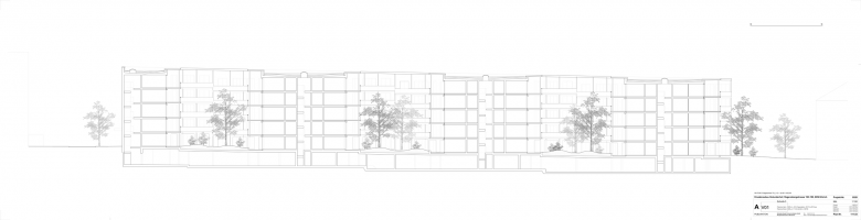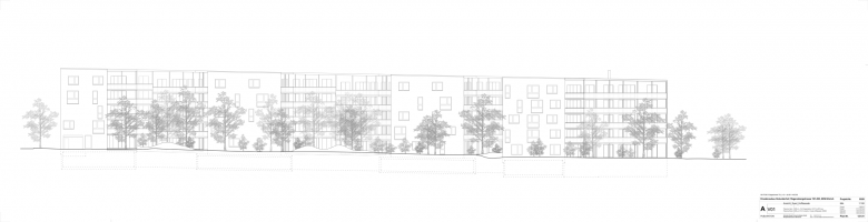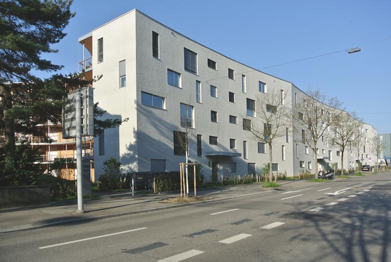 Ein einziges architektonisches Thema reicht aus, um auf den unterschiedlichsten städtebaulichen Ebenen Antworten auf die Frage der Einordnung einer neuen Siedlung in eine heterogene Umgebung zu geben. Der strassenbegleitende, lange Baukörper erhält durch die feine Wellenform einen nuancierten Rhythmus und entwickelt sich von da in die Tiefe der Parzelle zum öffentlichen Freiraum hin.